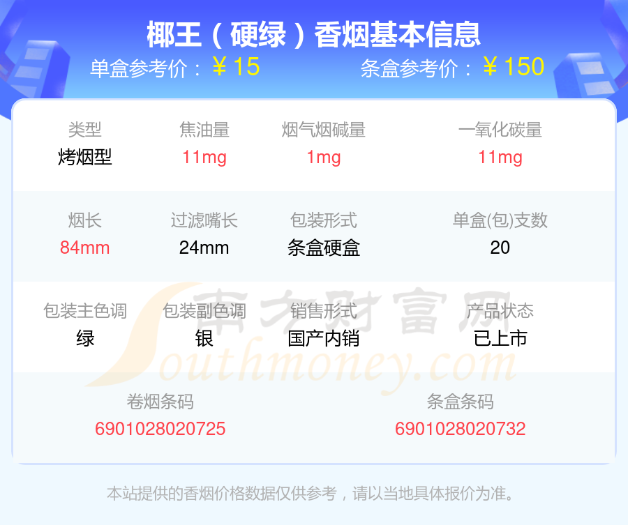 椰王(硬)参考价16元/包、椰王(硬绿)参考价15元/包、椰王(硬金)参考价35元/包等。