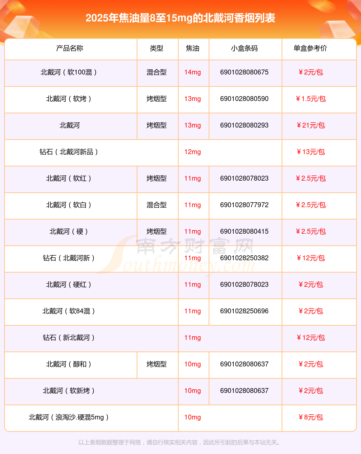 北戴河香烟焦油量8至15mg的烟有哪些?择烟网为大家整理提供,分别有:北戴河(软100混)、北戴河(软烤)、北戴河、钻石(北戴河新品)、北戴河(软红)、北戴河(软白)、北戴河(硬)、钻石(北戴河新)、北戴河(硬红)、北戴河(软84混)等,具体价格如下: