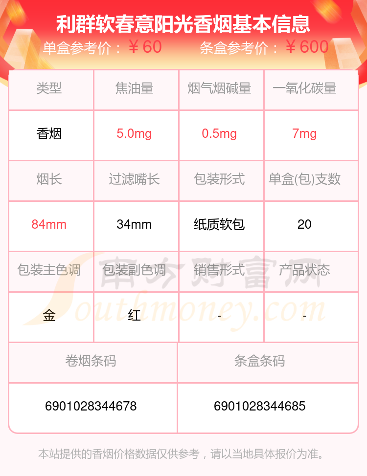 利群软春意阳光单盒参考价:60元