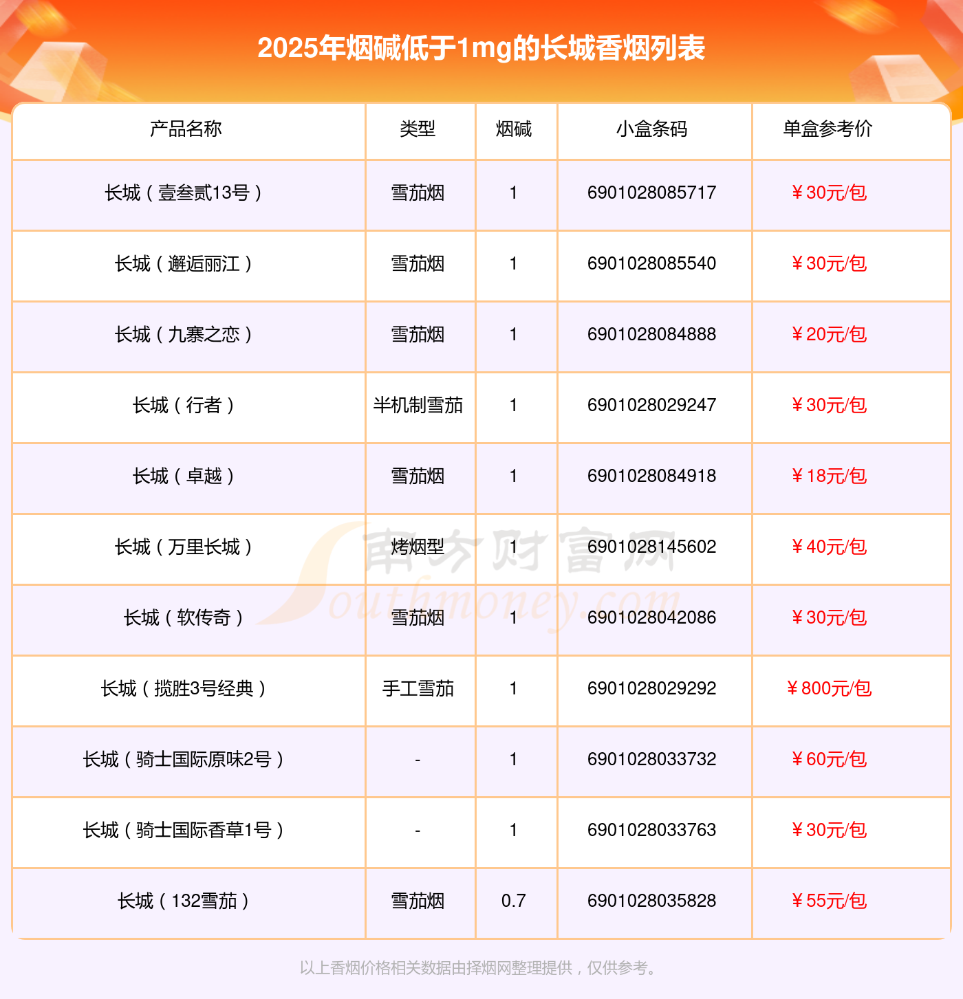 烟碱低于1mg的长城香烟有哪些?择烟网为大家整理盘点,有长城(壹叁贰13号)、长城(邂逅丽江)、长城(九寨之恋)、长城(行者)、长城(卓越)、长城(万里长城)、长城(软传奇)、长城(揽胜3号经典)、长城(骑士国际原味2号)、长城(骑士国际香草1号)等,详细价格如下: