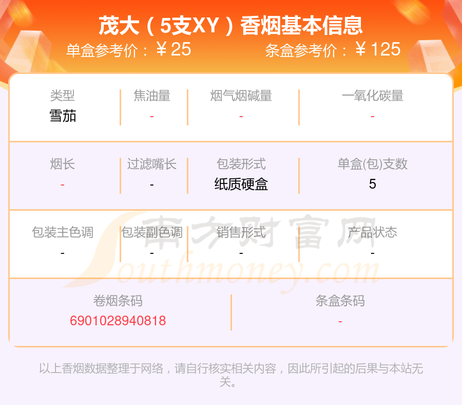 茂大(5支XY)条盒参考价:125元