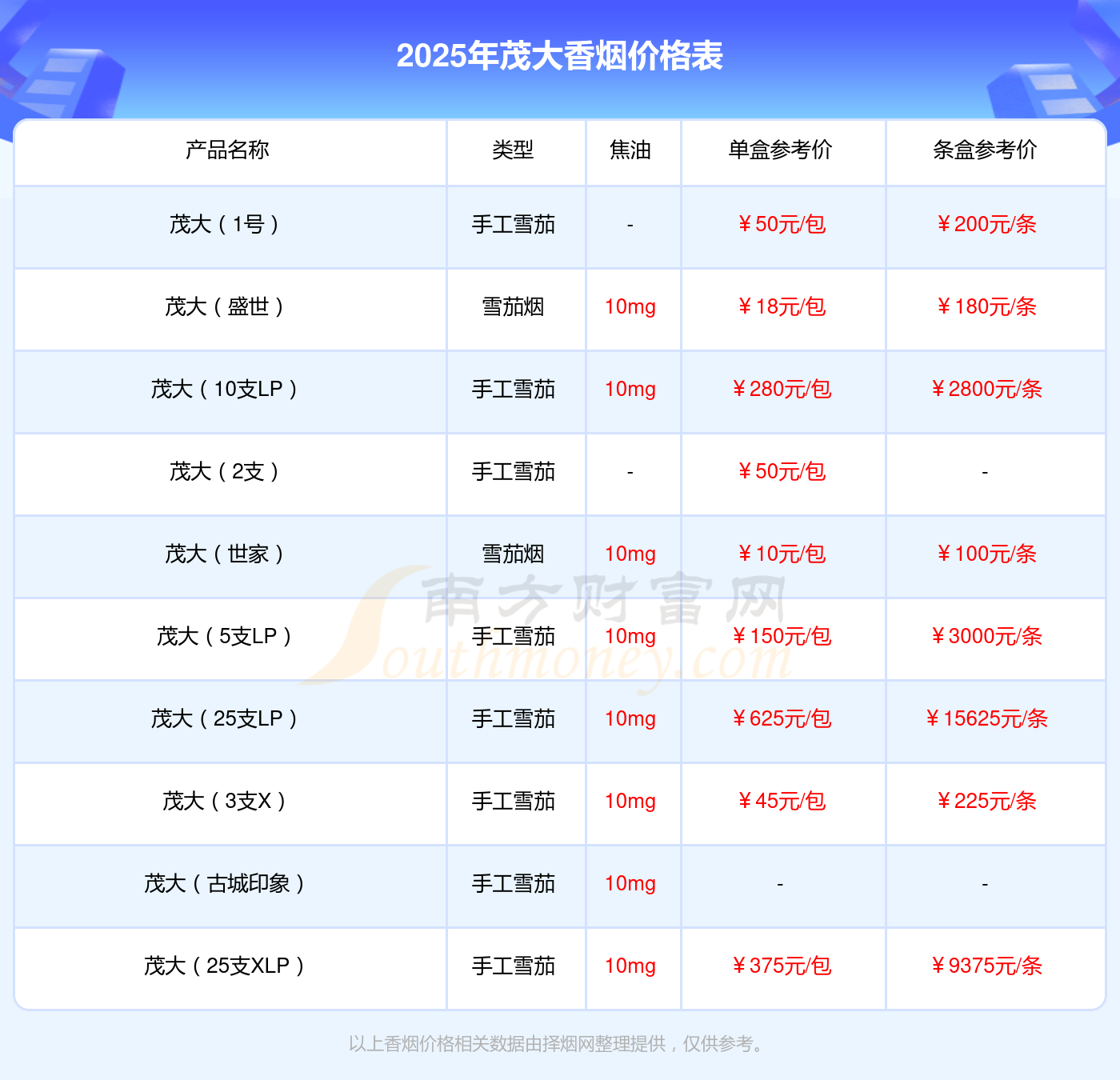 茂大(5支XY)单盒参考价:25元