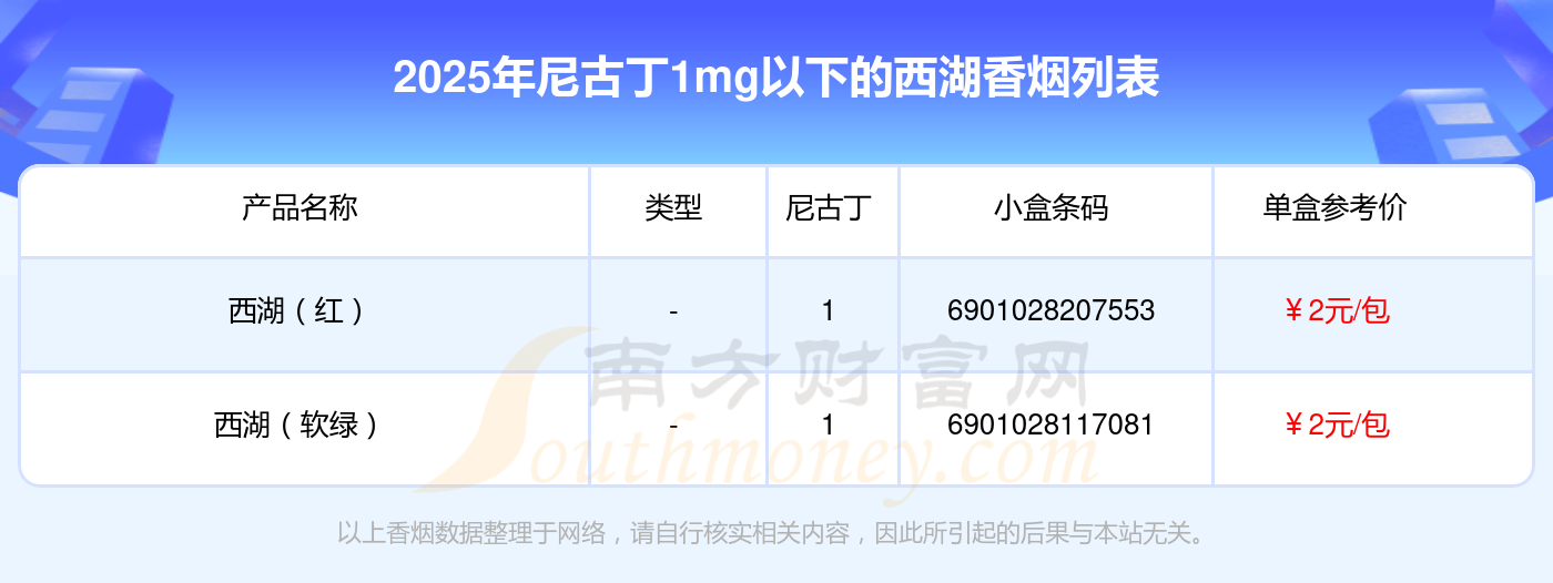 尼古丁1mg以下的西湖香烟2025都有哪些?