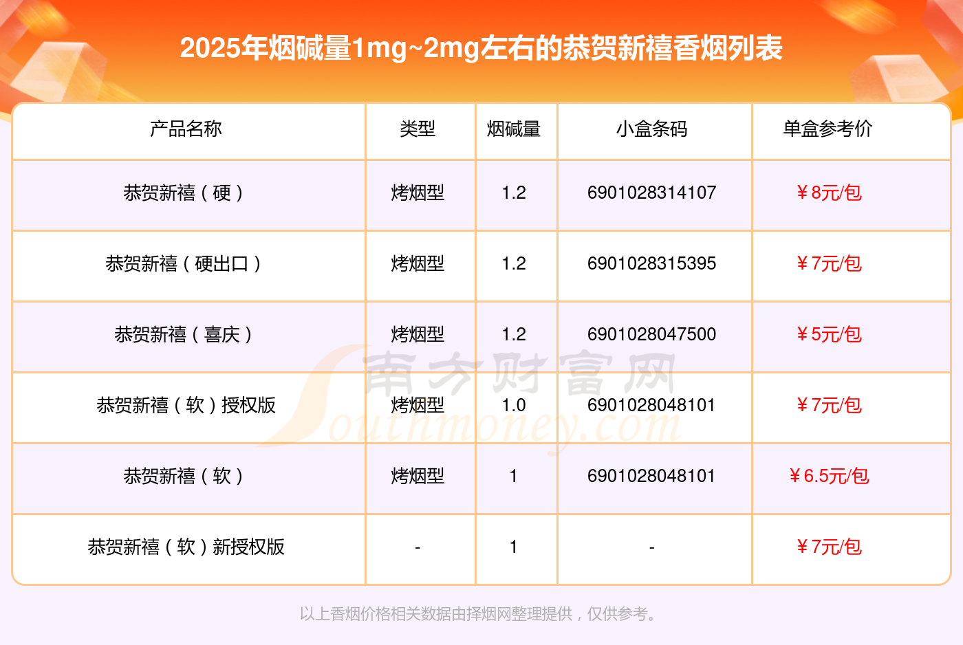 烟碱量1mg~2mg左右的恭贺新禧香烟有哪些?择烟网为大家整理盘点,有恭贺新禧(硬)、恭贺新禧(硬出口)、恭贺新禧(喜庆)、恭贺新禧(软)授权版、恭贺新禧(软)、恭贺新禧(软)新授权版等,详细价格如下: