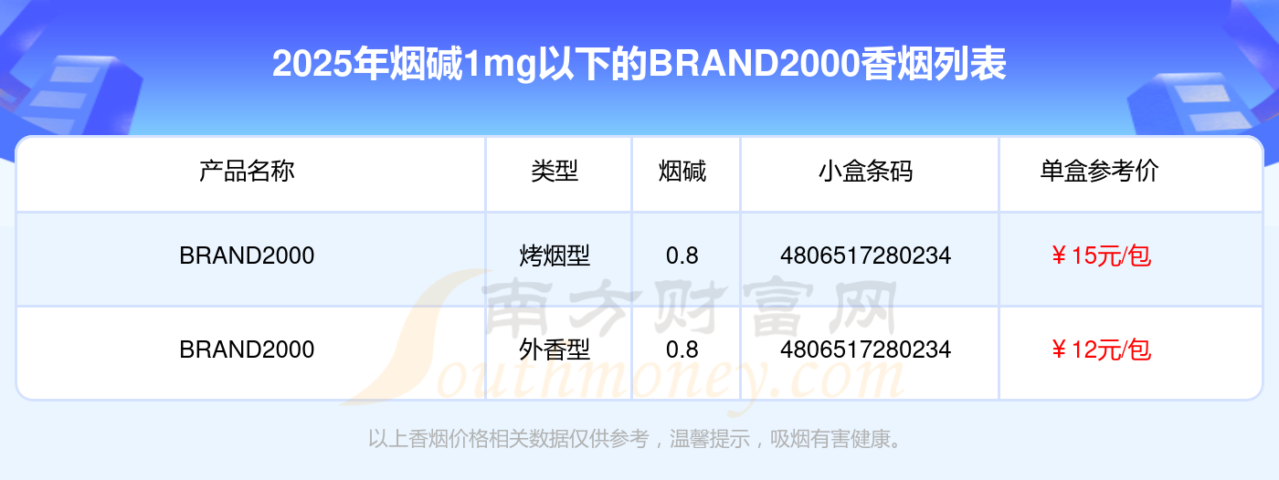 烟碱1mg以下的BRAND2000香烟有哪些?择烟网为大家整理盘点,分别有:BRAND2000、BRAND2000等,具体价格如下: