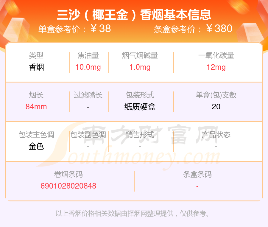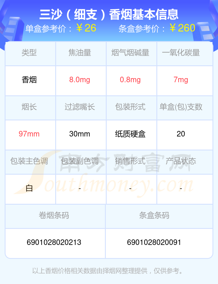 择烟网为大家盘点了三沙香烟尼古丁量1.5mg以下的,分别有三沙(椰王金)、三沙(金)、三沙(椰王绿)、三沙(细支)、三沙(中支)等,详细价格如下: