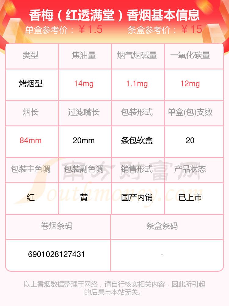择烟网为大家盘点了香梅香烟尼古丁量低于4mg的,分别有香梅(蓝透)、香梅(红透满堂)等,具体价格如下: