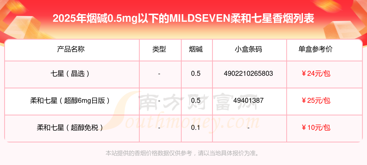 择烟网为大家盘点了烟碱0.5mg以下的MILDSEVEN柔和七星香烟,有七星(晶选)、柔和七星(超醇6mg日版)、柔和七星(超醇免税)等,详细价格如下: