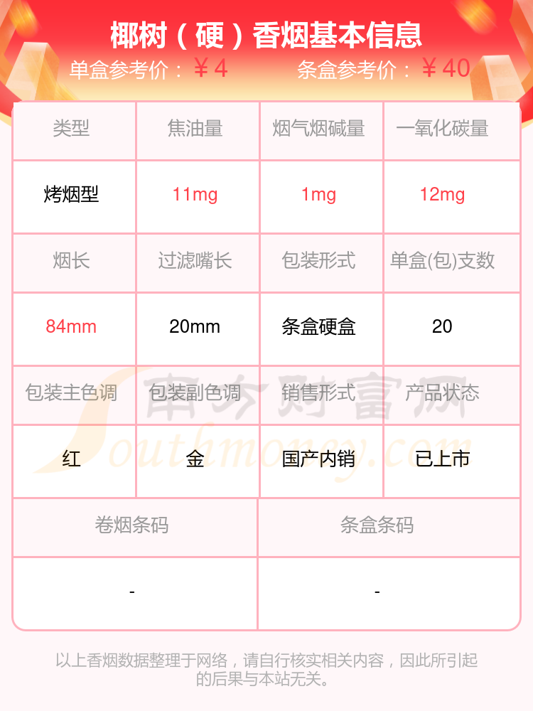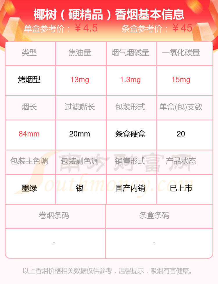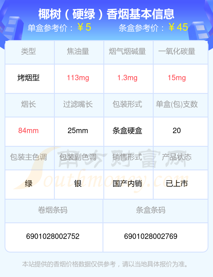 择烟网为大家盘点了尼古丁3mg以下的椰树香烟,分别有椰树(硬精品)、椰树(硬绿)、椰树(软)、椰树(硬)、椰树(特醇)等,具体价格如下: