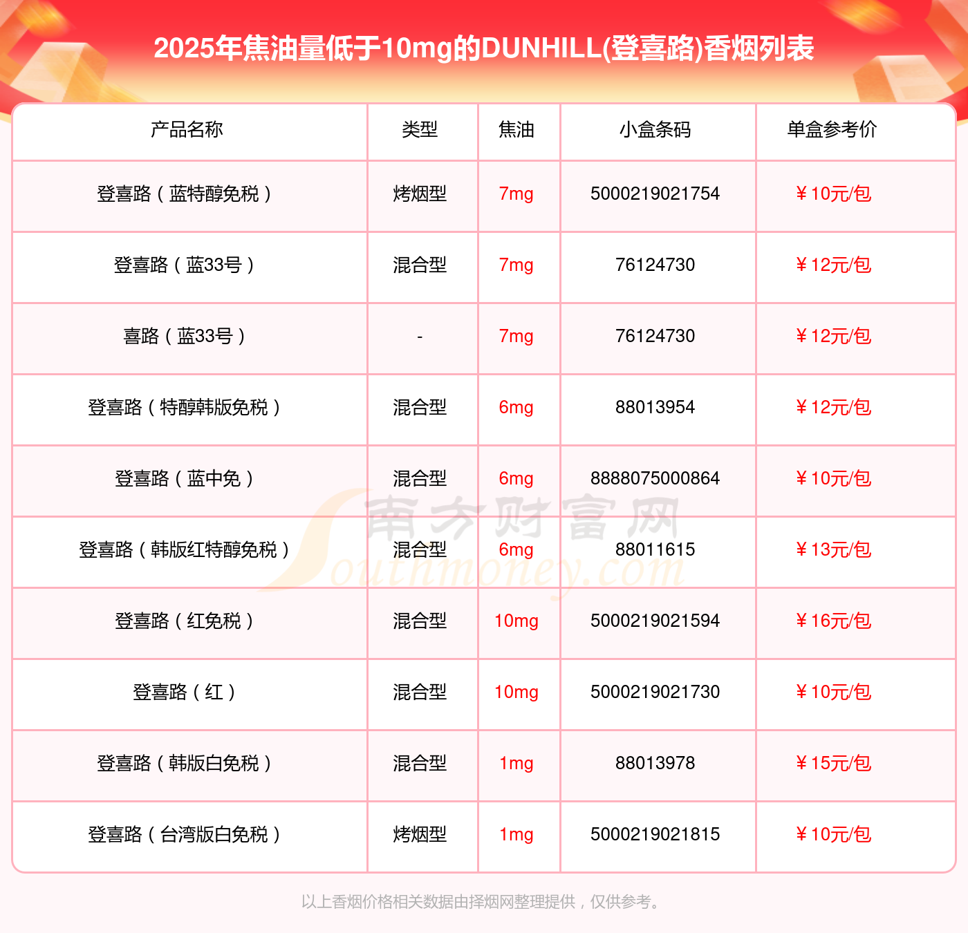 DUNHILL(登喜路)香烟焦油量低于10mg的烟分别有登喜路(蓝特醇免税)参考价10.0元/包、登喜路(蓝33号)参考价12.0元/包、喜路(蓝33号)参考价12元/包、登喜路(特醇韩版免税)参考价12.0元/包、登喜路(蓝中免)参考价10.0元/包、登喜路(韩版红特醇免税)参考价13.0元/包、登喜路(红免税)参考价16.0元/包、登喜路(红)参考价10元/包、登喜路(韩版白免税)参考价15.0元/包、登喜路(台湾版白免税)参考价10.0元/包等。