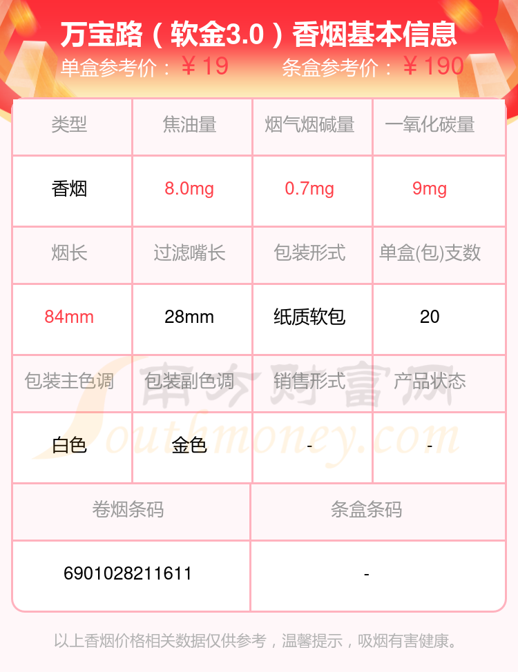 择烟网为大家盘点了万宝路(国产)香烟烟碱10mg以下的,分别有万宝路(硬红 中免)、万宝路(软红2.0)、万宝路(软红)、万宝路(硬红2.0)、万宝路(软金3.0)、万宝路(硬金3.0)、万宝路(硬冰爵)、万宝路(硬冰爵2.0)、万宝路(软白)、万宝路(硬金)等,详细价格如下: