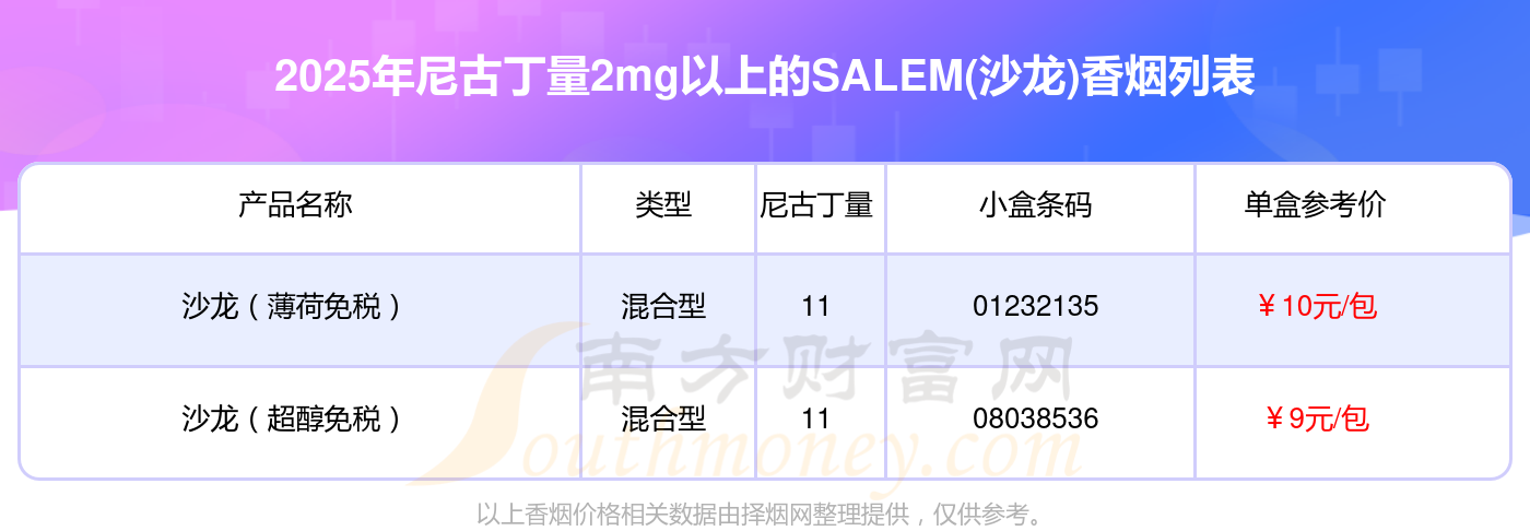 尼古丁量2mg以上的SALEM(沙龙)香烟有哪些?择烟网为大家整理盘点,分别有:沙龙(薄荷免税)、沙龙(超醇免税)等,具体价格如下:
