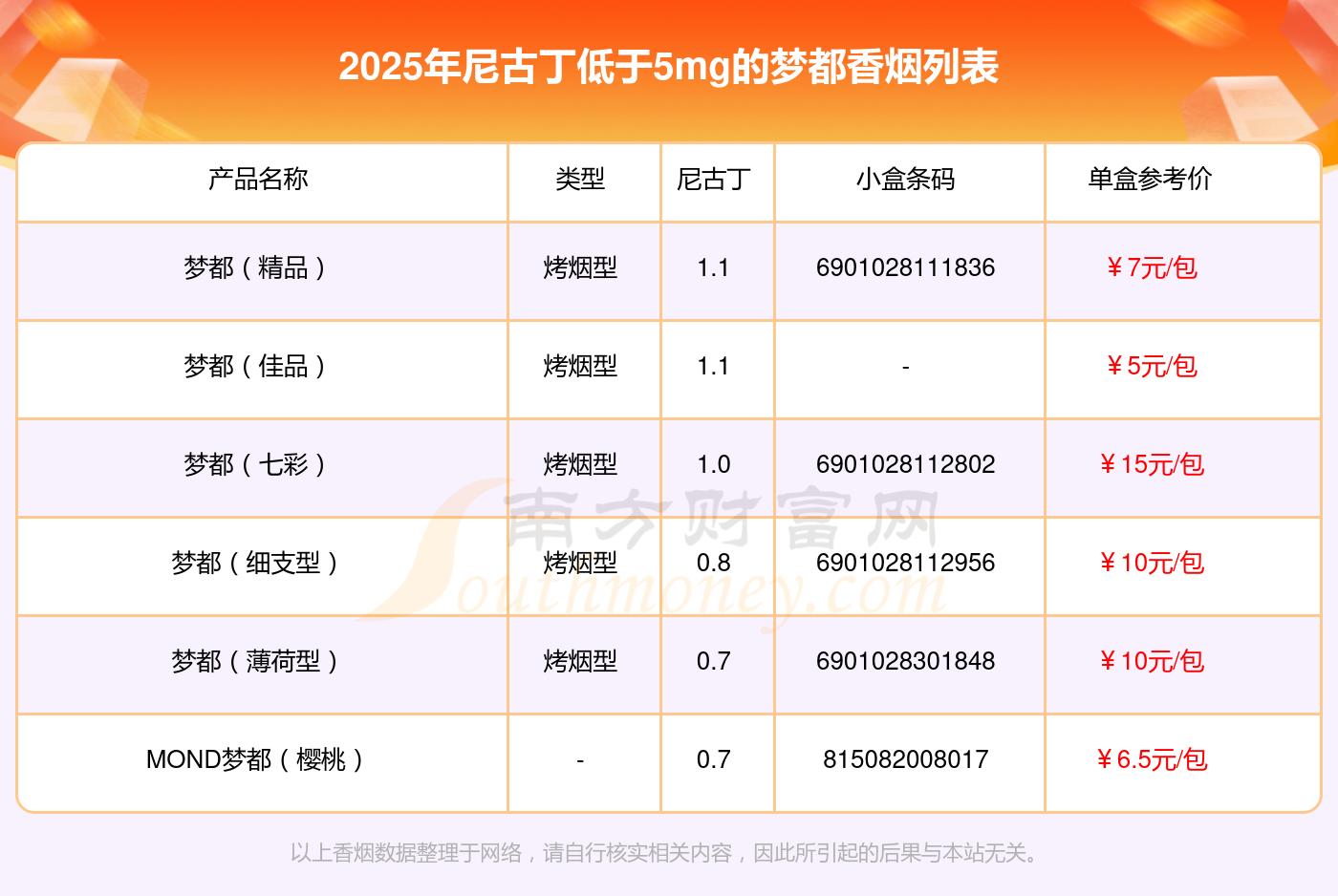 梦都(精品)参考价7.0元/包、梦都(佳品)参考价5.0元/包、梦都(七彩)参考价15.0元/包、梦都(细支型)参考价10.0元/包、梦都(薄荷型)参考价10元/包、MOND梦都(樱桃)参考价6.5元/包等。