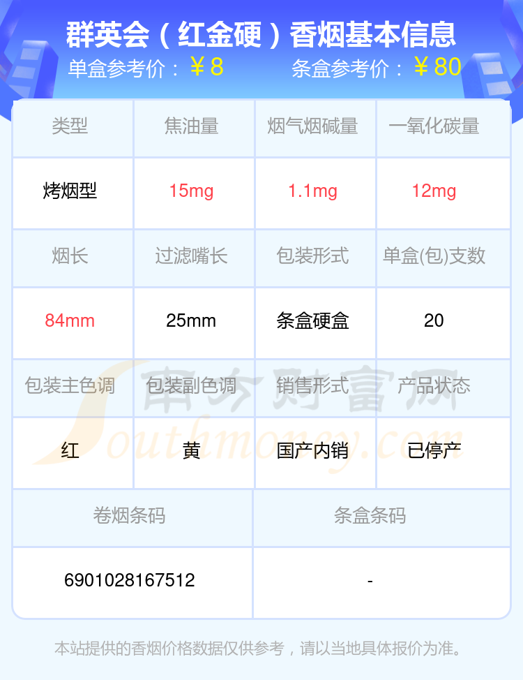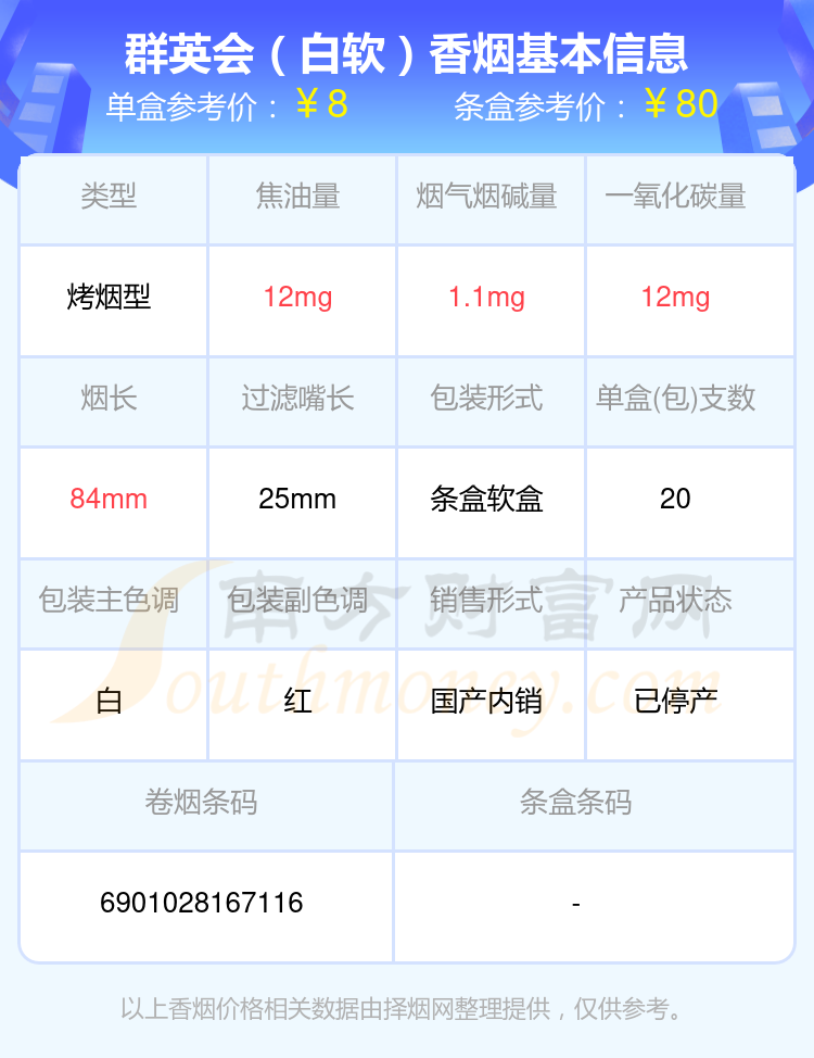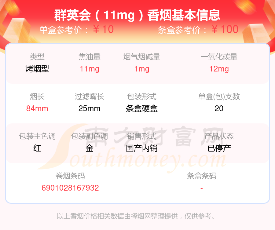 群英会香烟尼古丁4mg以下的烟有哪些?择烟网为大家整理提供,分别有:群英会(红金硬)、群英会(白软)、群英会(11mg)等,具体价格如下: