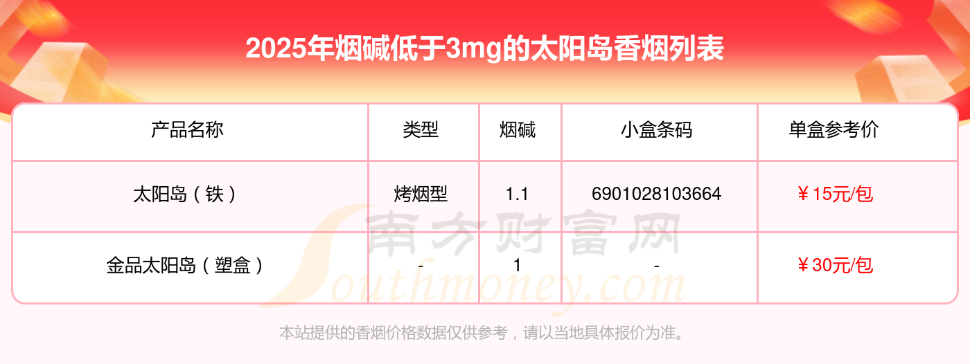烟碱低于3mg的太阳岛香烟有哪些?择烟网为大家整理盘点,分别有:太阳岛(铁)、金品太阳岛(塑盒)等,具体价格如下: