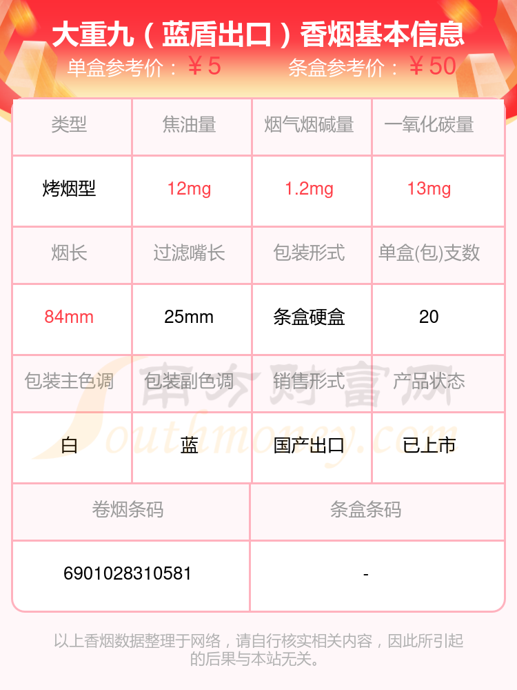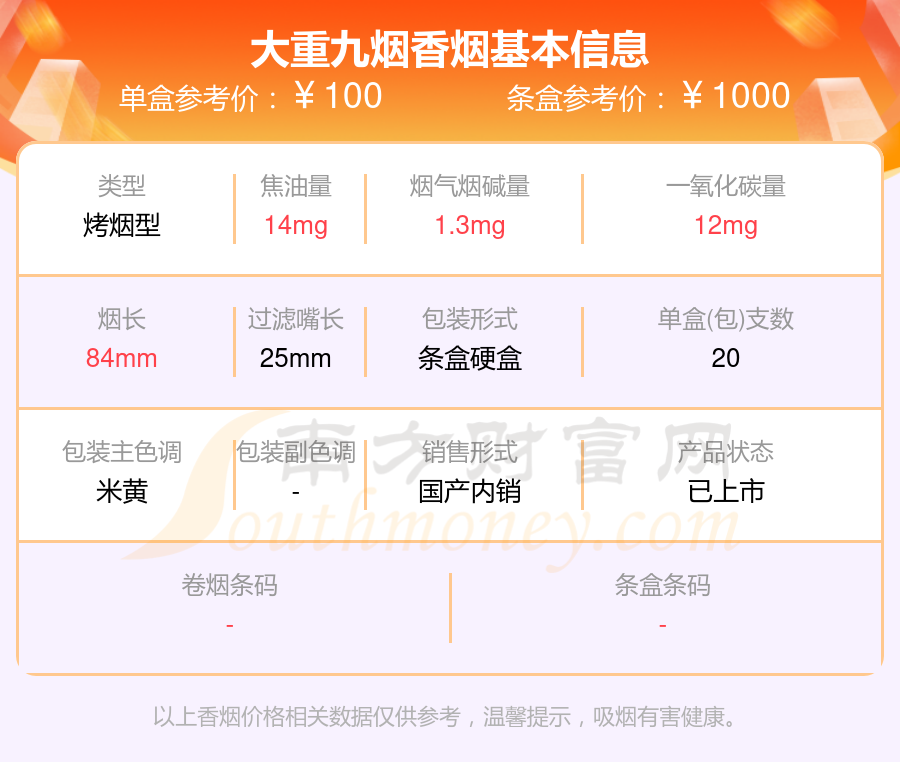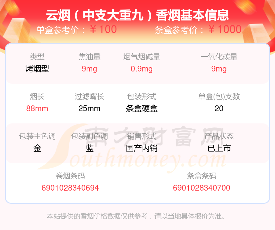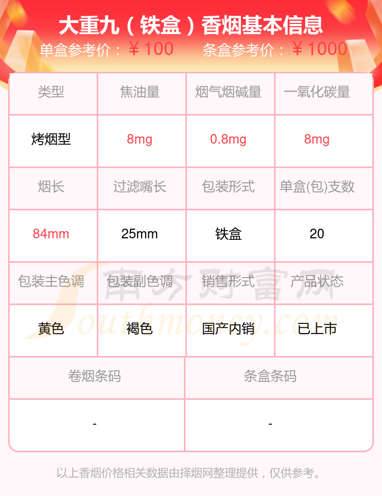 云烟(中支大重九)参考价100元/包、大重九(铁盒)参考价100元/包、大重九烟参考价100元/包、大重九(蓝盾出口)参考价5元/包等。
