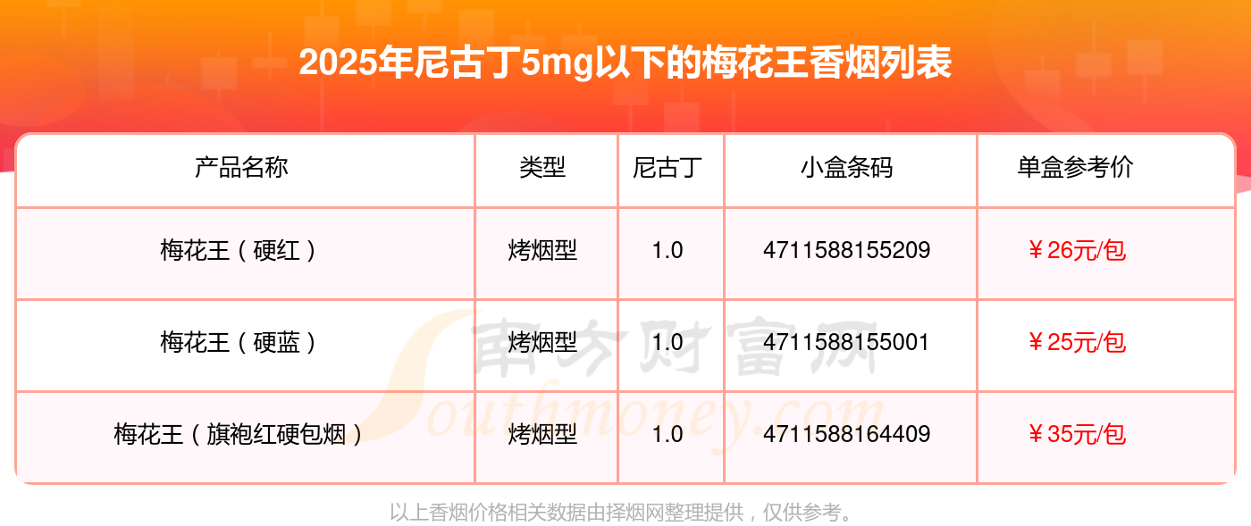 尼古丁5mg以下的梅花王香烟有哪些?择烟网为大家整理盘点,有梅花王(硬红)、梅花王(硬蓝)、梅花王(旗袍红硬包烟)等,详细价格如下: