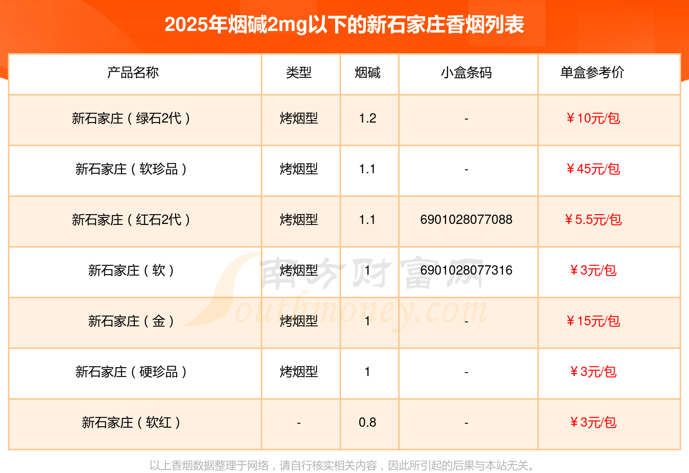 新石家庄香烟烟碱2mg以下的烟分别有新石家庄(绿石2代)参考价10元/包、新石家庄(软珍品)参考价45元/包、新石家庄(红石2代)参考价5.5元/包、新石家庄(软)参考价3元/包、新石家庄(金)参考价15元/包、新石家庄(硬珍品)参考价3元/包、新石家庄(软红)参考价3元/包等。