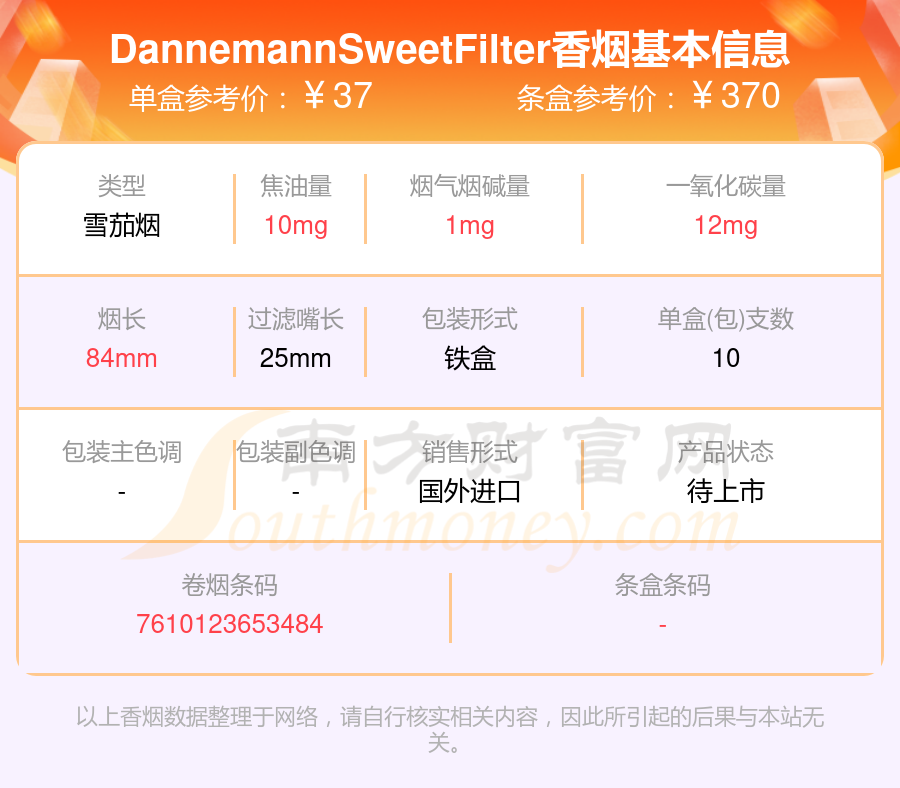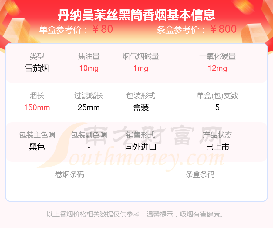 DannemannSweetFilter参考价37元/包、丹纳曼茉丝黑筒参考价80元/包、丹纳曼茉丝红筒参考价80元/包、丹纳曼所罗门(25支装)参考价360元/包、丹纳曼白筒参考价75元/包、丹纳曼金筒(3支装)参考价125元/包、丹纳曼(特选所罗门)参考价68元/包等。