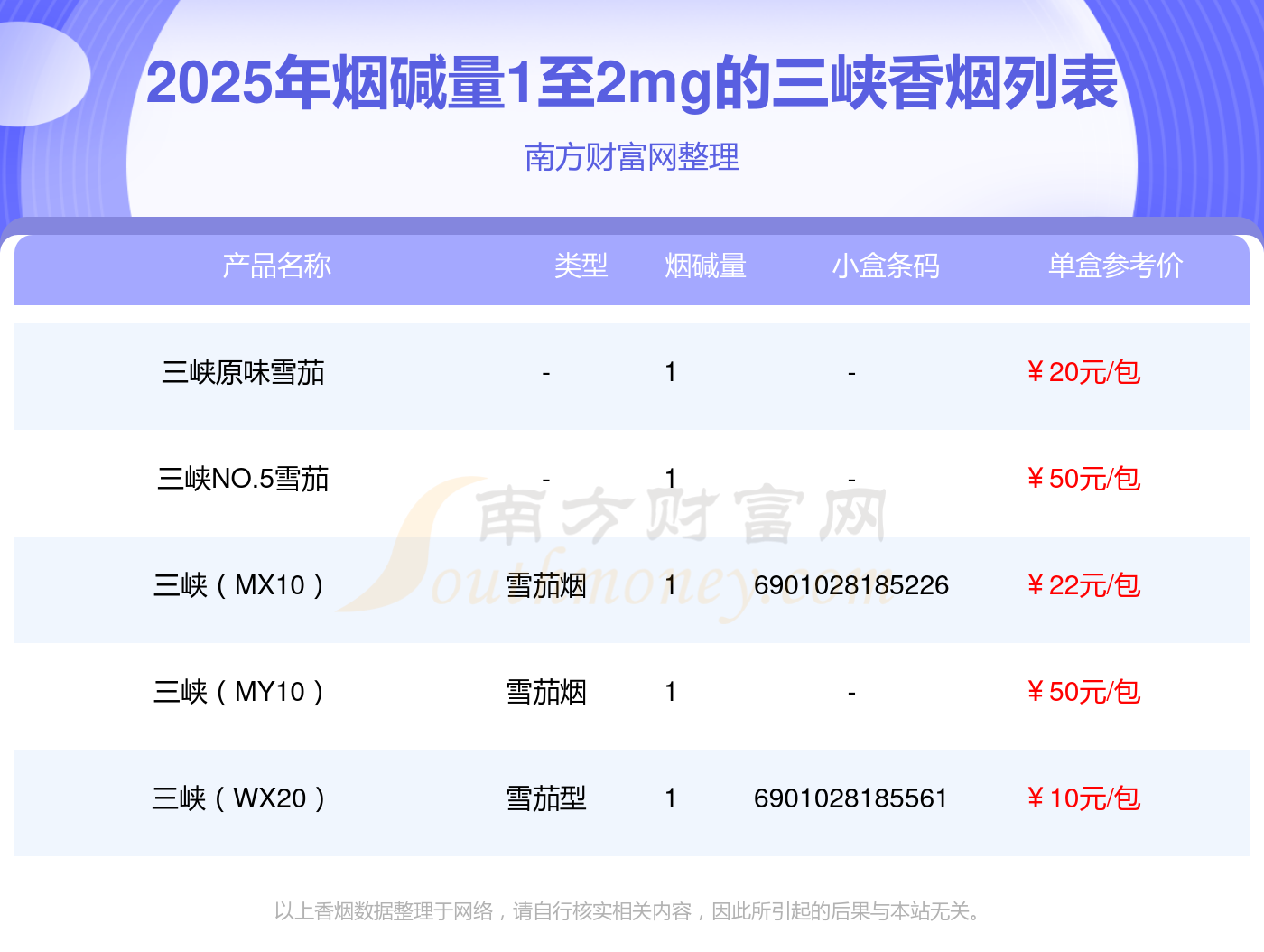 择烟网为大家盘点了三峡香烟烟碱量1至2mg的,分别有三峡原味雪茄、三峡NO.5雪茄、三峡(MX10)、三峡(MY10)、三峡(WX20)等,详细价格如下: