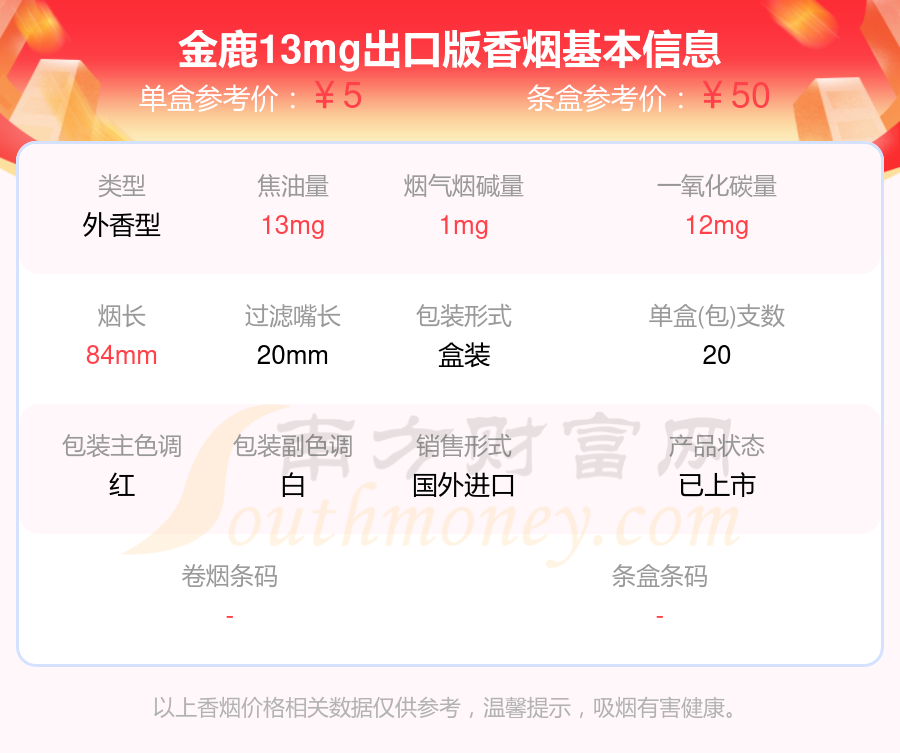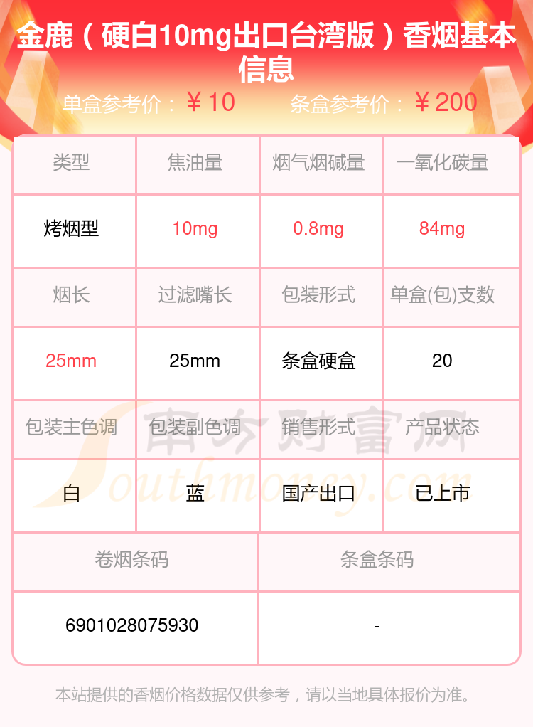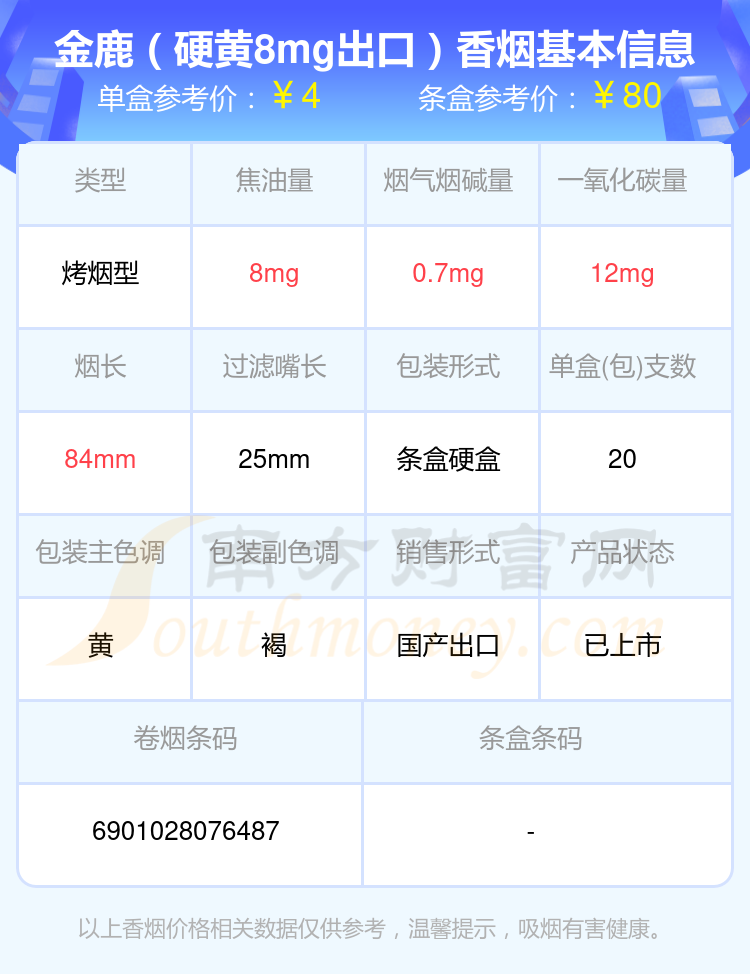 GOLDEN HIND金鹿香烟焦油量8-15mg的烟有金鹿(8mg)、金鹿(硬黄8mg)出口台湾版本、金鹿(硬8mg出口)、金鹿(硬黄8mg出口)、金鹿13mg出口版、金鹿(硬12mg出口)、金鹿菲律宾免税版、金鹿(硬白10mg出口台湾版)等,详细价格如下:
