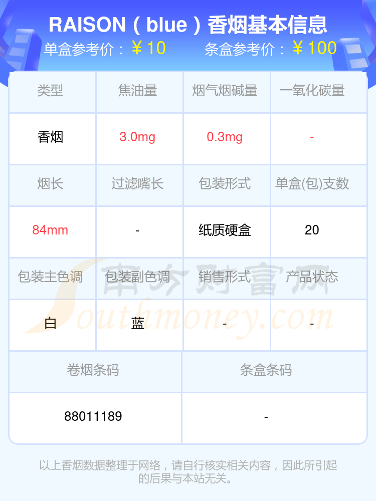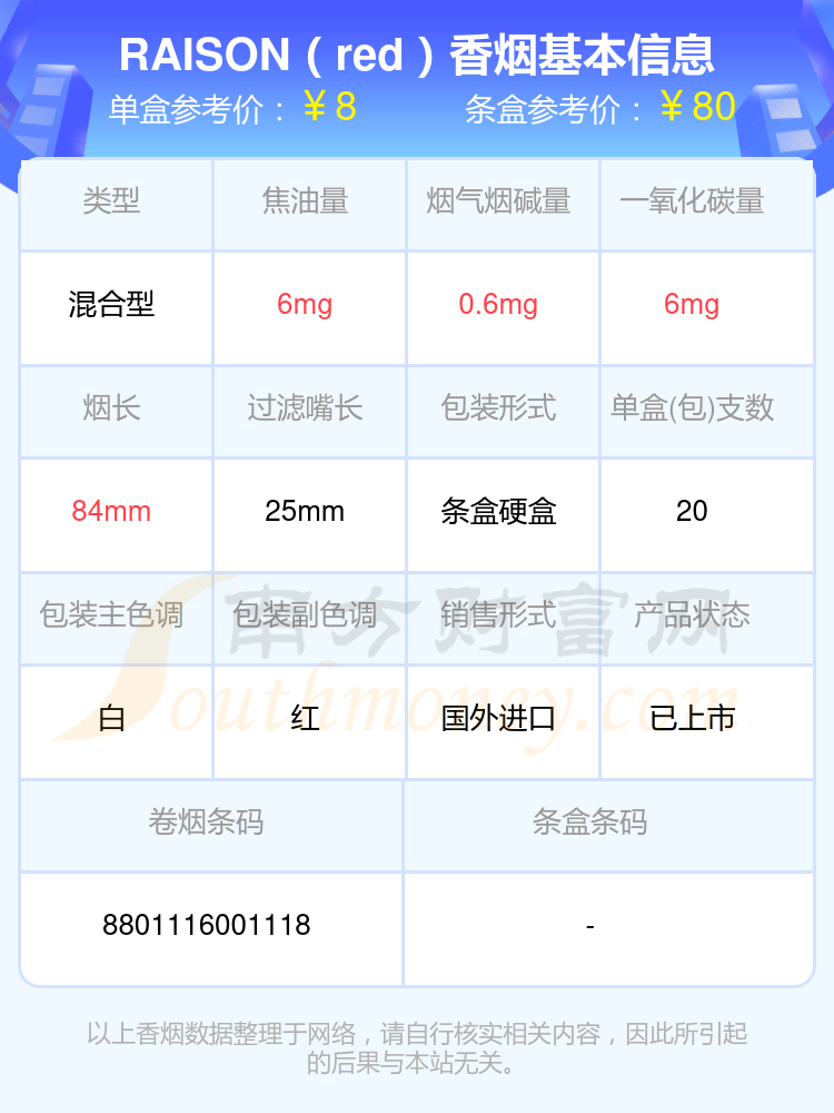 择烟网为大家盘点了烟碱1mg以下的RAISON(韩国猫)香烟,有RAISON(red)、RAISON(blue)等,详细价格如下: