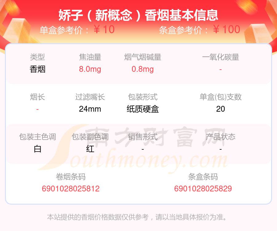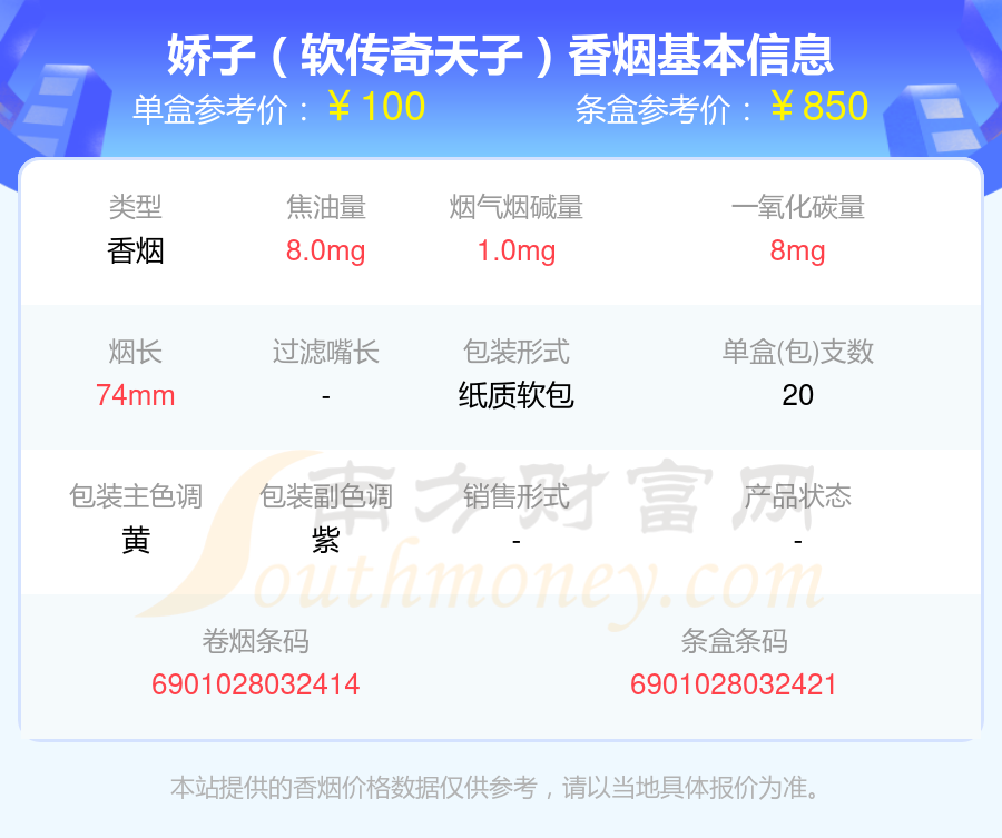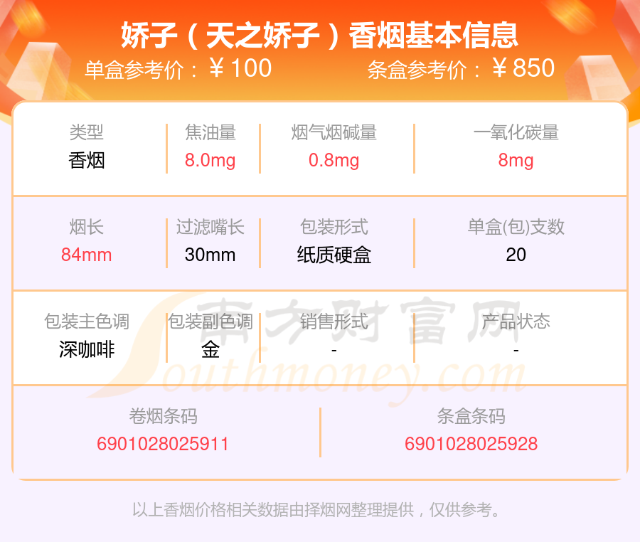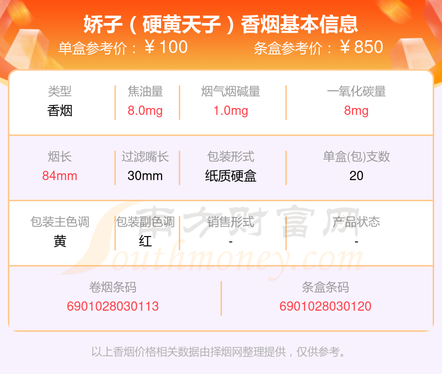 择烟网为大家盘点了焦油量8mg以下的娇子香烟,有娇子(硬黄天子)、娇子(龙涎香)、娇子(格调细支)、娇子(新概念)、娇子(硬红逸品)、娇子(宽窄逍遥细支)、娇子(天之娇子)、娇子(软传奇天子)、娇子(硬正黄天子)、娇子(宽窄好运细支)等,详细价格如下: