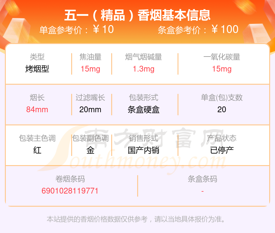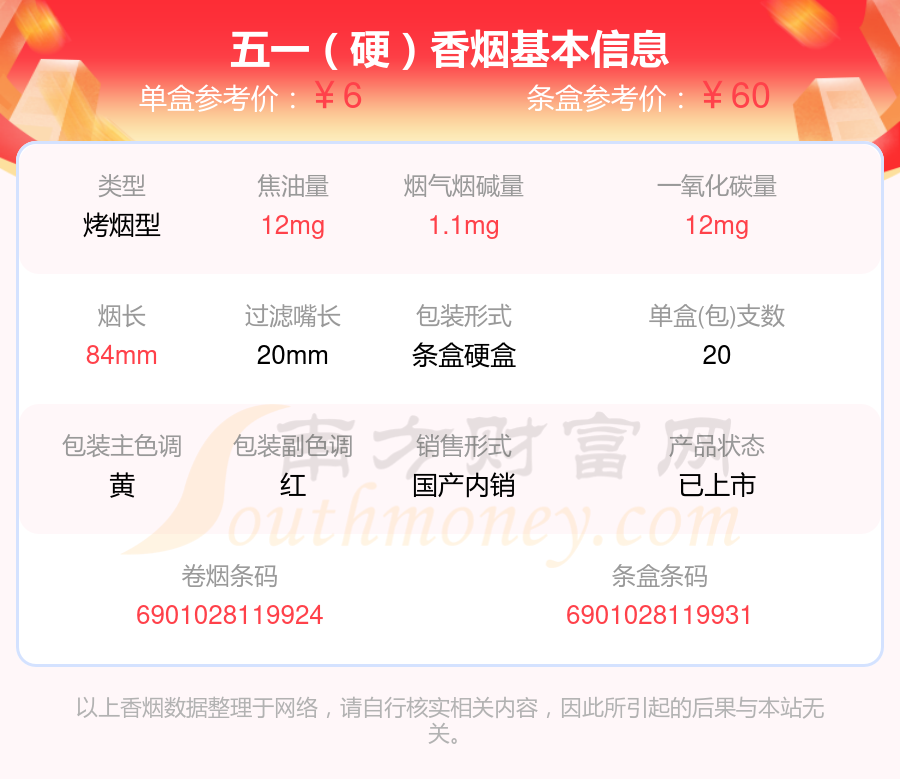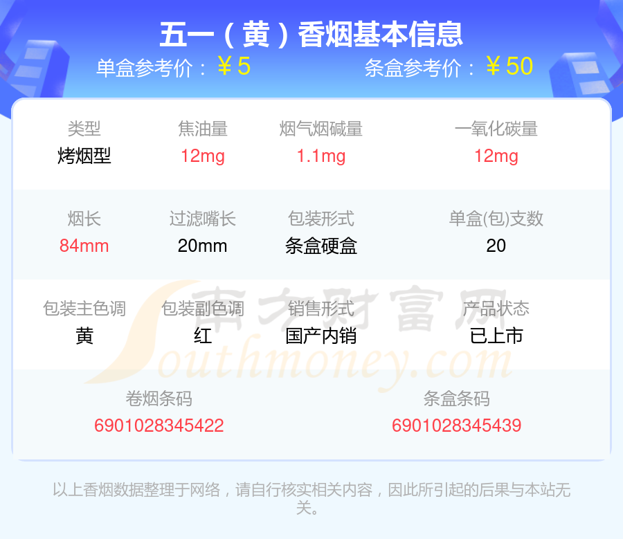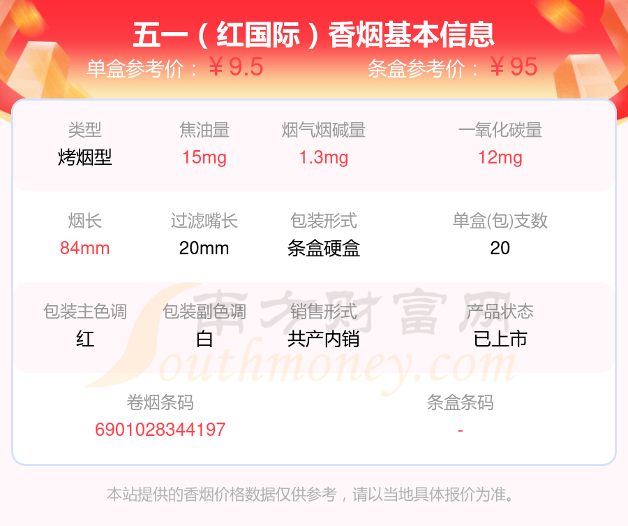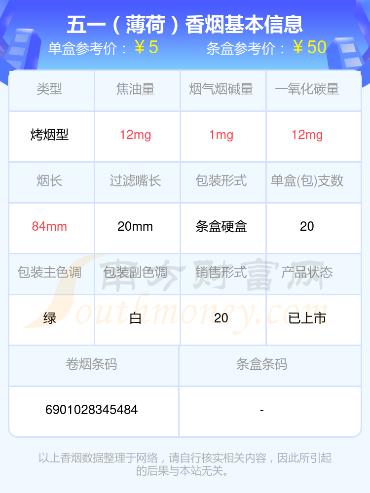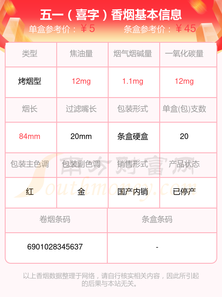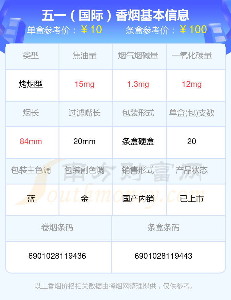 五一香烟烟碱量3mg以下的烟有五一(精品)、五一(红国际)、五一(国际)、五一(软国际)、五一(硬)、五一(喜字)、五一(黄)、五一(薄荷)等,具体价格如下: