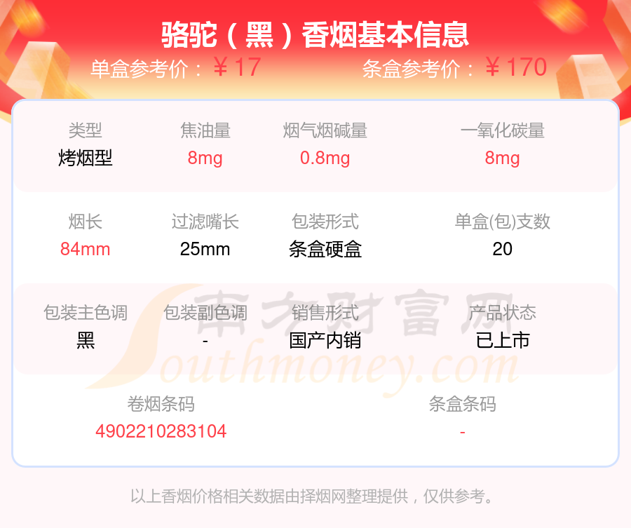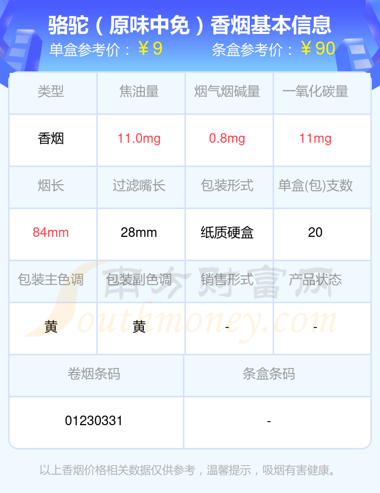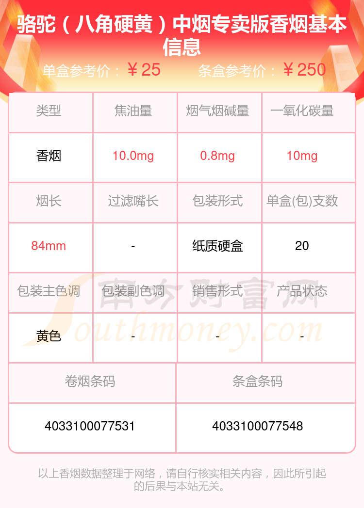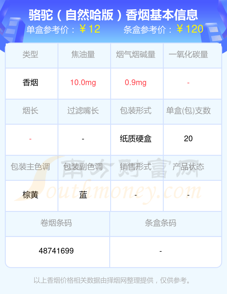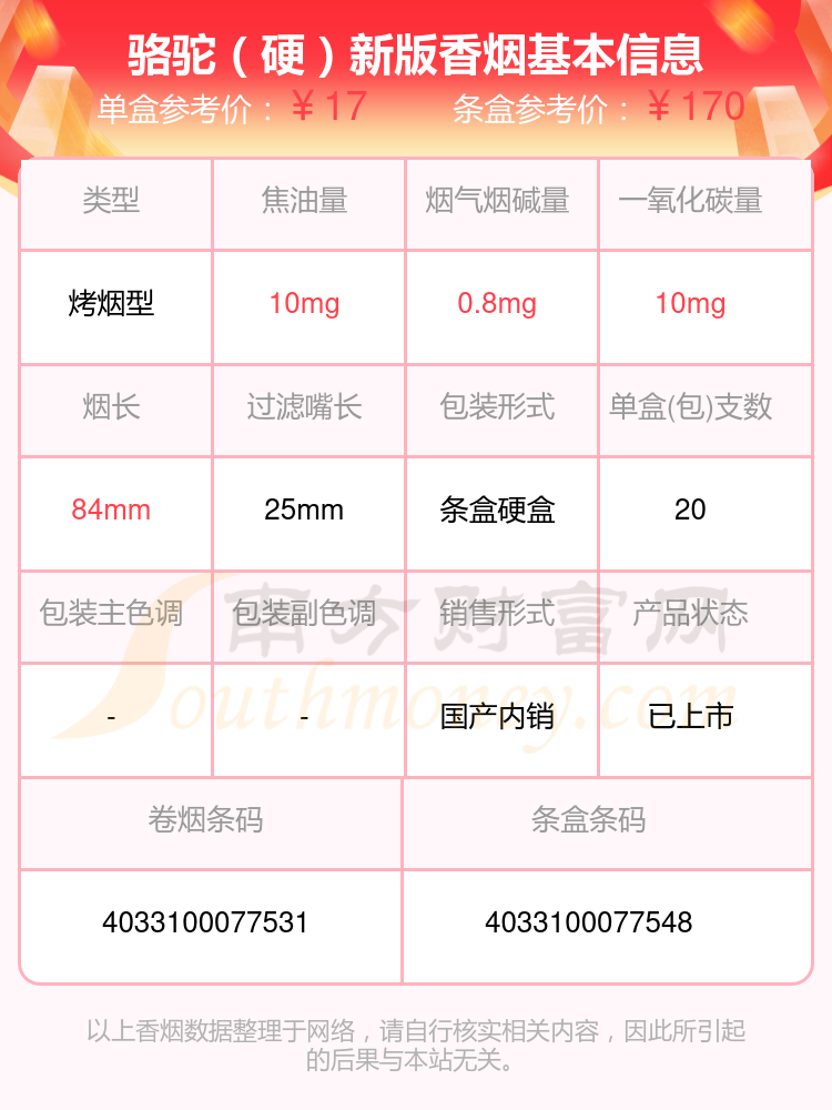 骆驼(自然哈版)参考价12.0元/包、骆驼(原味中免)参考价9.0元/包、骆驼(硬黄)吉尔吉斯斯坦含税版参考价11.0元/包、骆驼(硬黄)塔吉克斯坦含税版参考价11.0元/包、骆驼(卡斯特)免税版参考价16.0元/包、骆驼(八角硬黄)中烟专卖版参考价25.0元/包、骆驼(烟草版)参考价15.0元/包、骆驼(硬)新版参考价17元/包、骆驼(原味新版)参考价15元/包、骆驼(黑)参考价17元/包等。