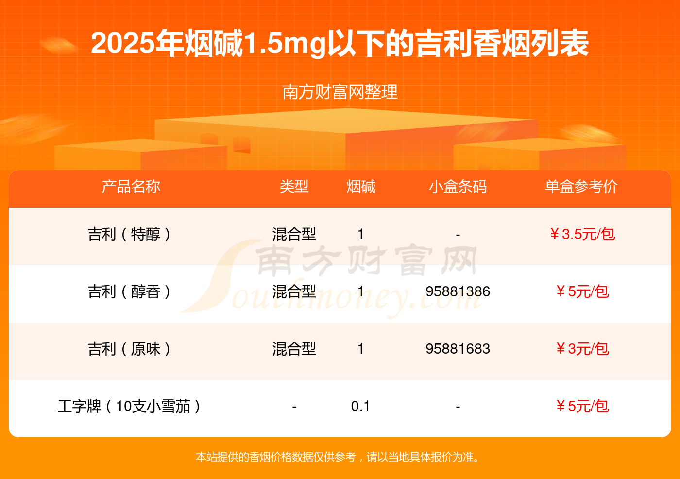 烟碱1.5mg以下的吉利香烟有哪些?择烟网为大家整理盘点,有吉利(特醇)、吉利(醇香)、吉利(原味)、工字牌(10支小雪茄)等,详细价格如下: