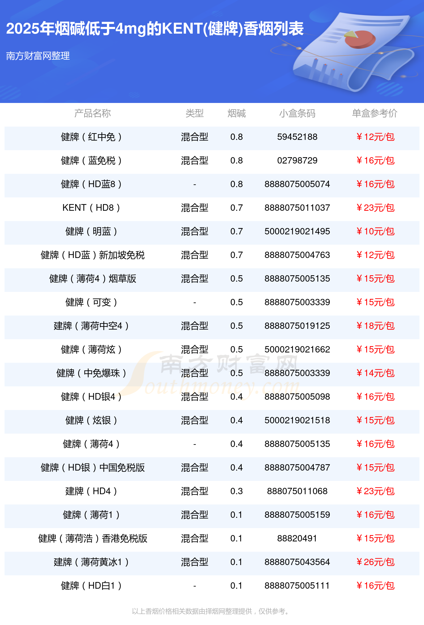 KENT(健牌)香烟烟碱低于4mg的烟有健牌(红中免)、健牌(蓝免税)、健牌(HD蓝8)、KENT(HD8)、健牌(明蓝)、健牌(HD蓝)新加坡免税、健牌(薄荷4)烟草版、健牌(可变)、建牌(薄荷中空4)、健牌(薄荷炫)等,详细价格如下: