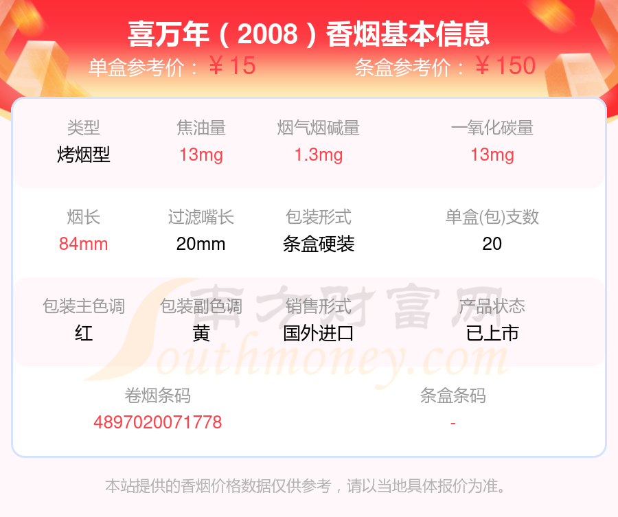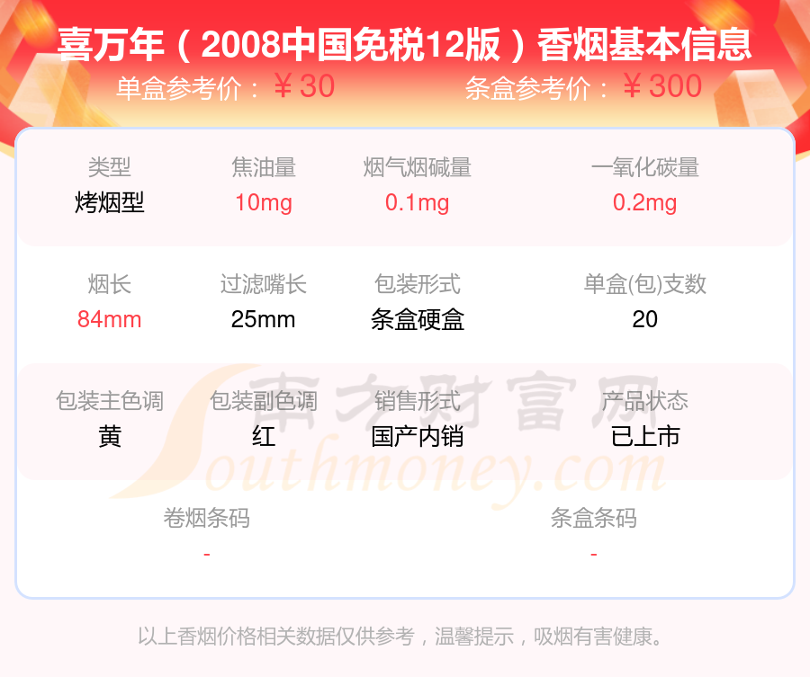 喜万年香烟烟碱1.5mg以下的烟有喜万年(2008)、喜万年(2008中国免税12版)、喜万年(盛世)等,详细价格如下: