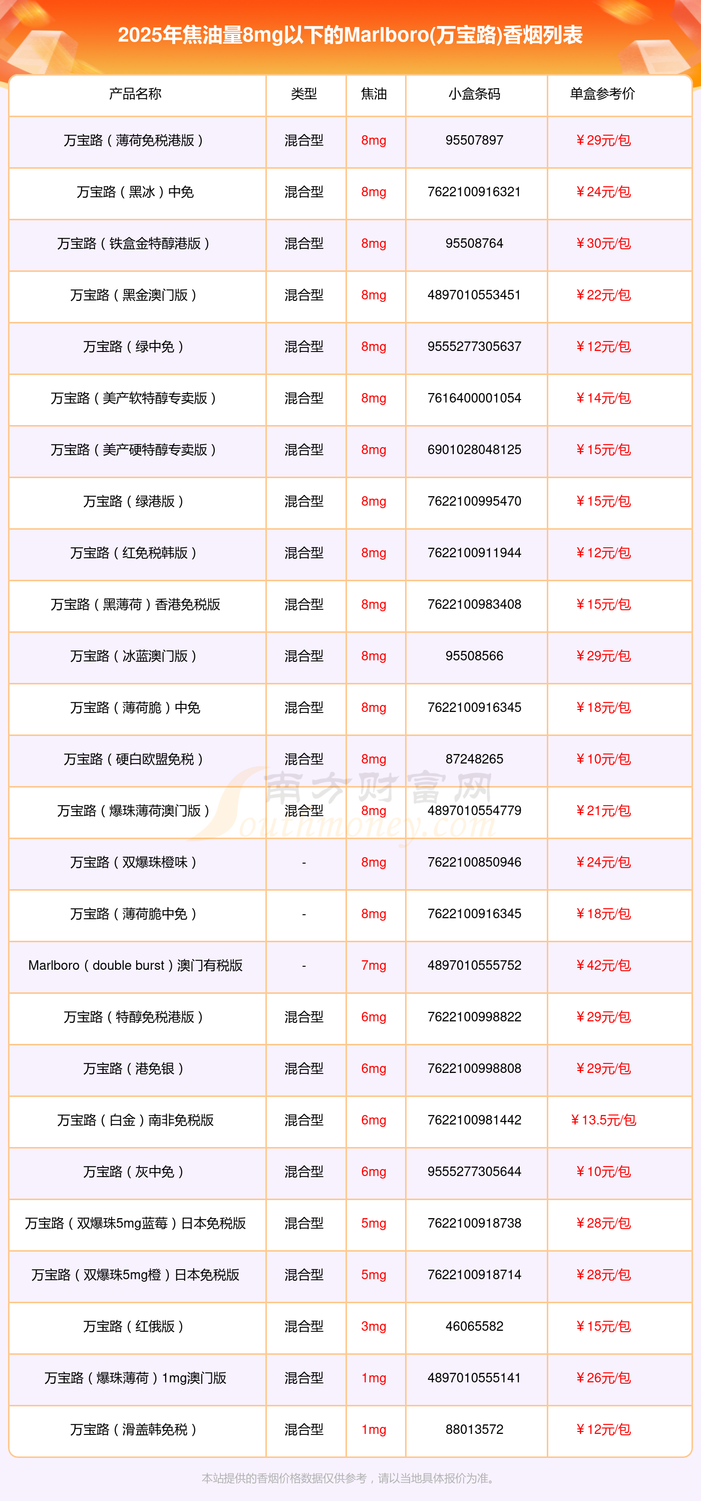 万宝路(薄荷免税港版)参考价29.0元/包、万宝路(黑冰)中免参考价24.0元/包、万宝路(铁盒金特醇港版)参考价30.0元/包、万宝路(黑金澳门版)参考价22.0元/包、万宝路(绿中免)参考价12.0元/包、万宝路(美产软特醇专卖版)参考价14.0元/包、万宝路(美产硬特醇专卖版)参考价15.0元/包、万宝路(绿港版)参考价15.0元/包、万宝路(红免税韩版)参考价12.0元/包、万宝路(黑薄荷)香港免税版参考价15.0元/包等。