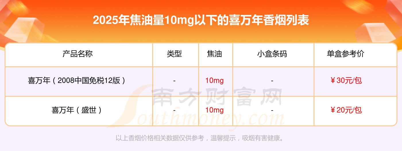 喜万年香烟焦油量10mg以下的有哪些?择烟网为大家整理提供,分别有: