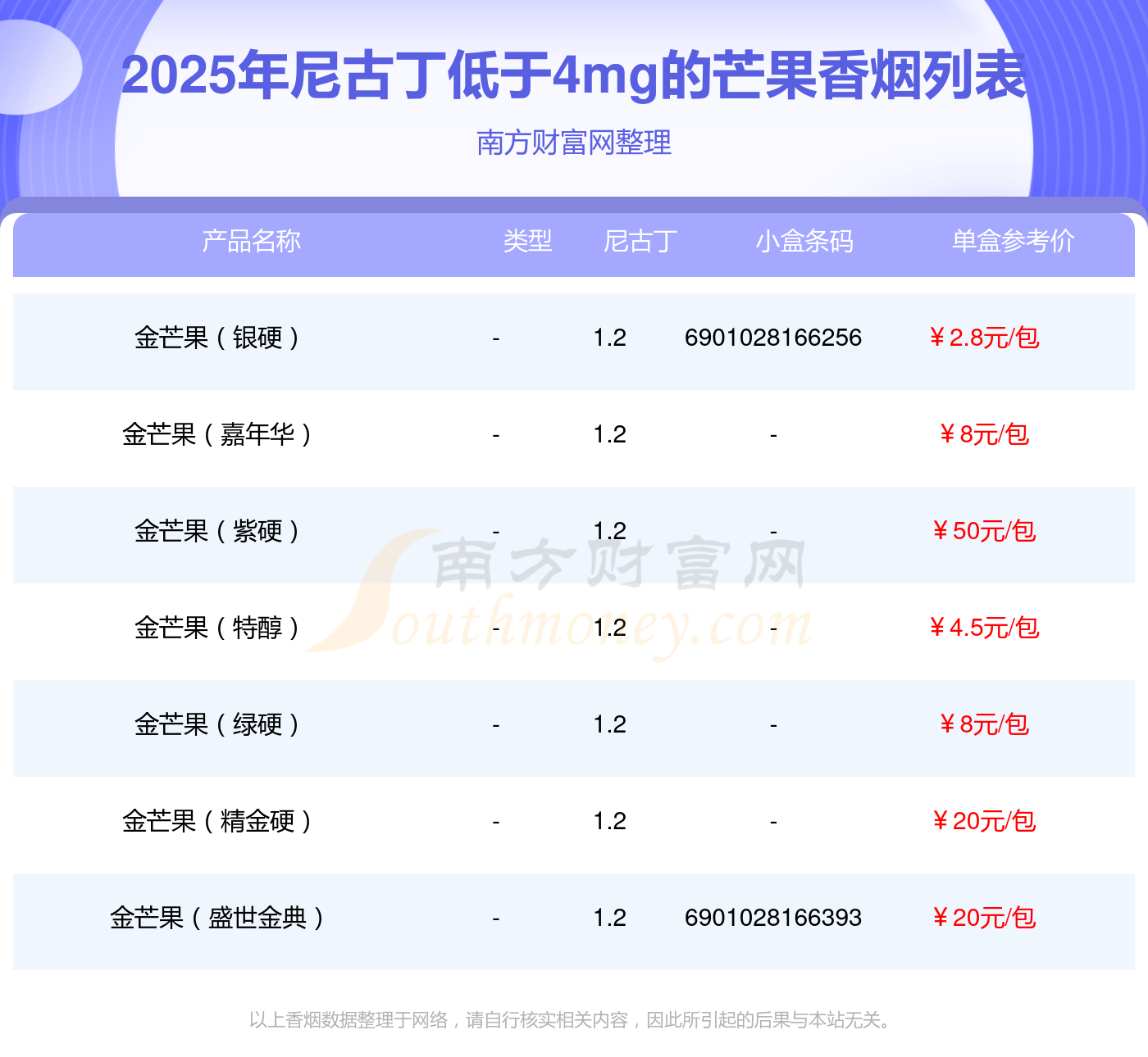 尼古丁低于4mg的芒果香烟有哪些?择烟网为大家整理盘点,分别有: