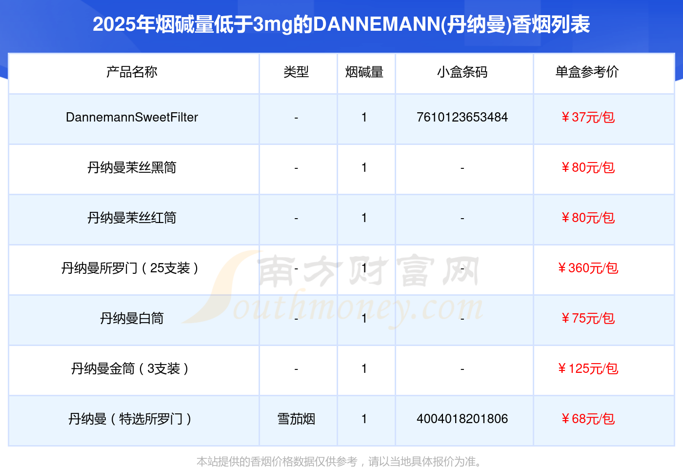DannemannSweetFilter参考价37元/包、丹纳曼茉丝黑筒参考价80元/包、丹纳曼茉丝红筒参考价80元/包、丹纳曼所罗门(25支装)参考价360元/包、丹纳曼白筒参考价75元/包、丹纳曼金筒(3支装)参考价125元/包、丹纳曼(特选所罗门)参考价68元/包等。