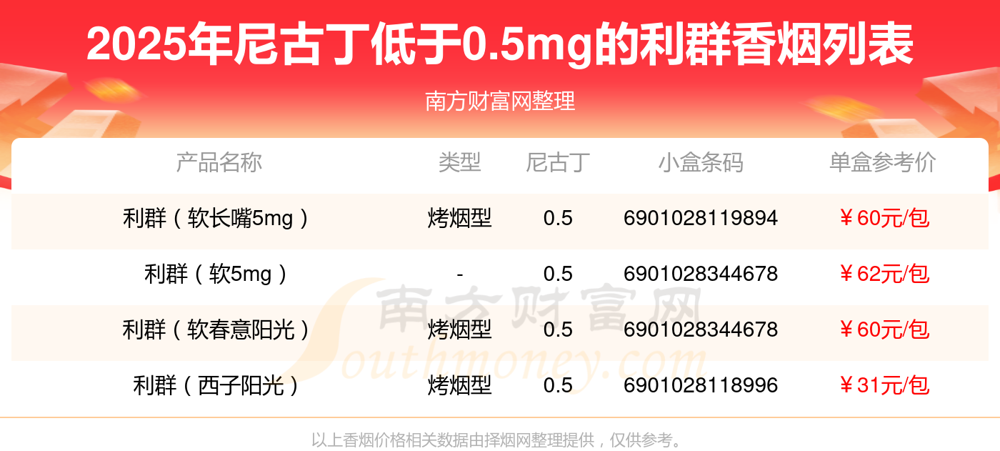 利群香烟尼古丁低于0.5mg的烟分别有利群(软长嘴5mg)参考价60.0元/包、利群(软5mg)参考价62元/包、利群(软春意阳光)参考价60.0元/包、利群(西子阳光)参考价31.0元/包等。