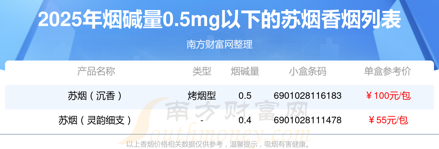 择烟网为大家盘点了烟碱量0.5mg以下的苏烟香烟,有以下这些: