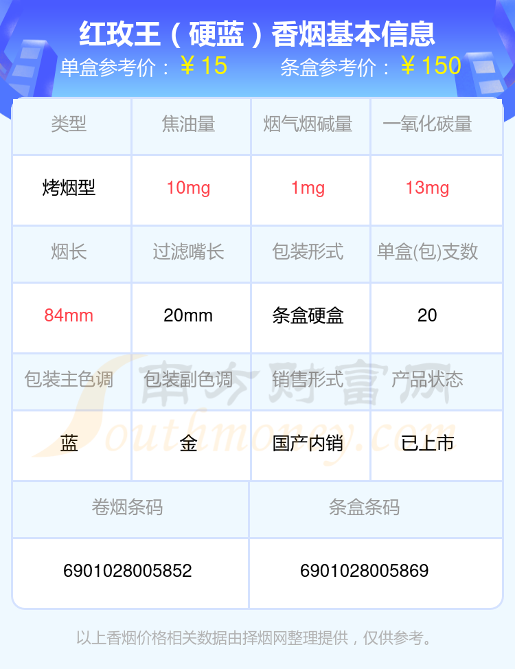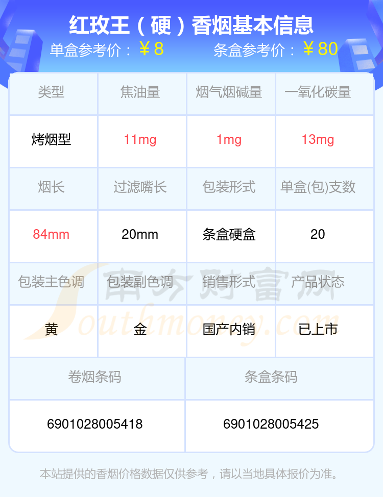 红玫王香烟尼古丁1mg-2mg左右的烟有红玫王(硬至尊)、红玫王(硬)、红玫王(硬蓝)、红玫王(软至尊)等,具体价格如下: