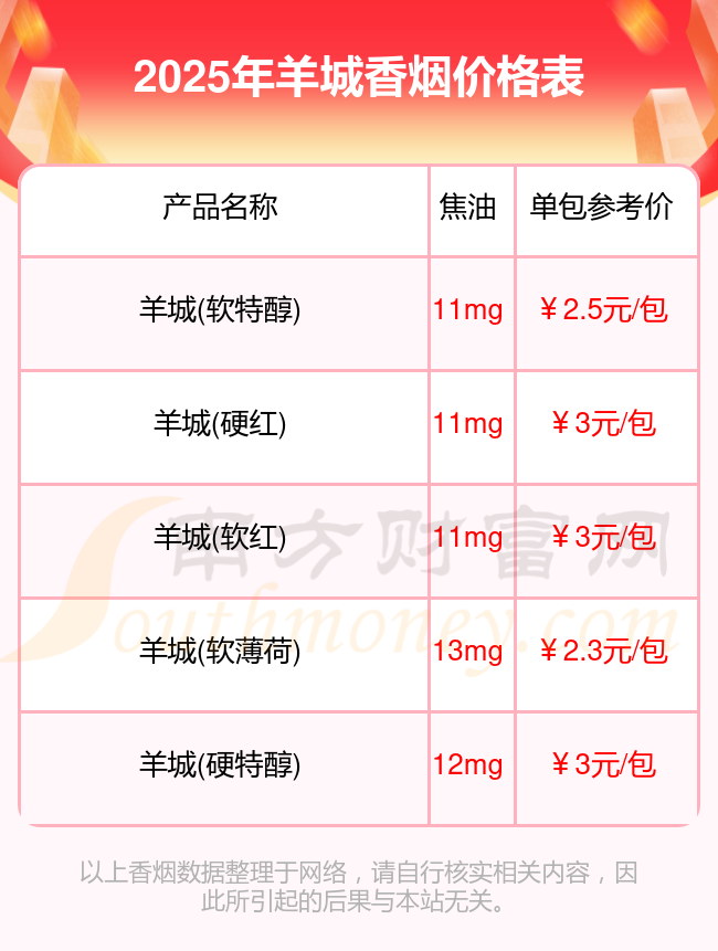 2025羊城香烟最新价格:羊城(软红)参考价3.0元/包、羊城(硬红)参考价3.0元/包、羊城(硬特醇)参考价3.0元/包、羊城(软特醇)参考价2.5元/包。