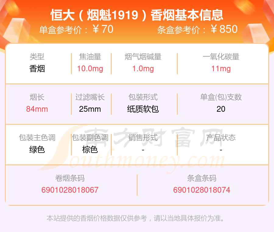 恒大(烟魁1919)参考价70.0元/包、恒大(全开式烟魁)参考价100.0元/包等。