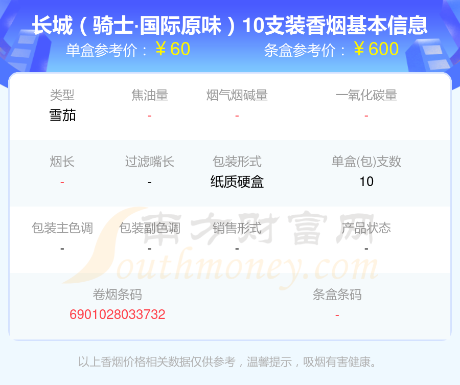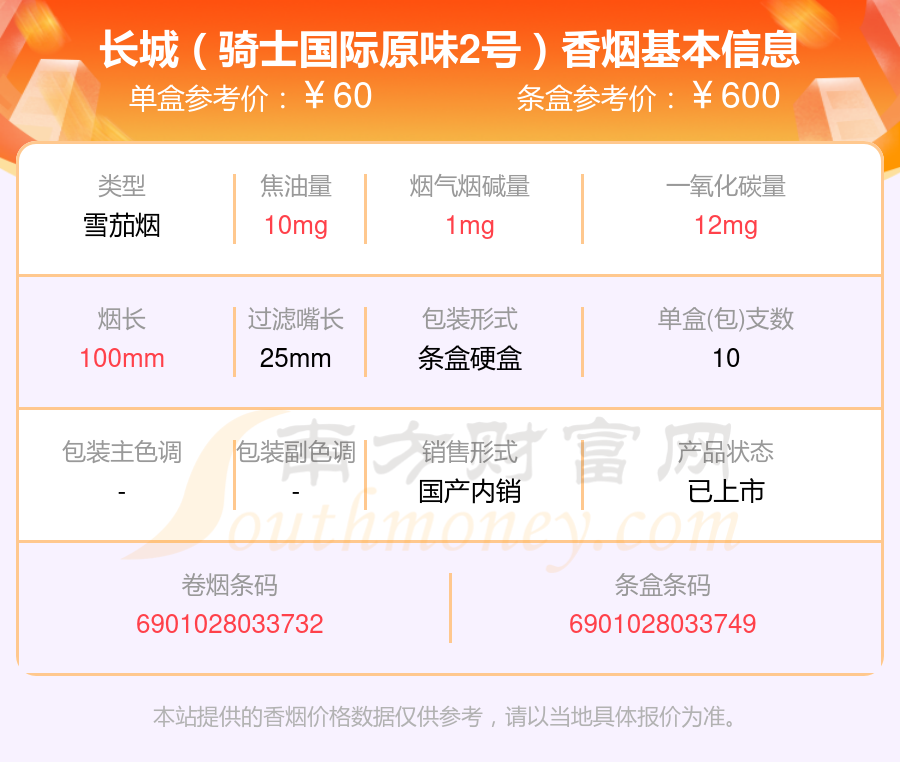 择烟网为大家盘点了60~70元的长城香烟,分别有长城(骑士·国际香草)10支装、长城(骑士·国际原味)10支装、长城(骑士国际原味2号)等,具体价格如下: