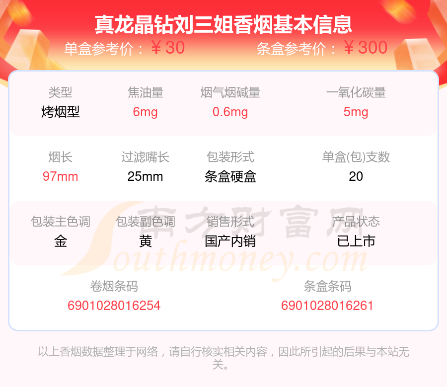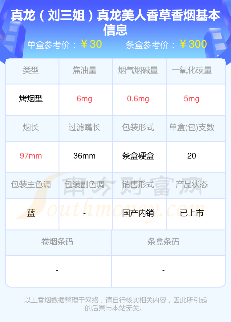 刘三姐香烟三十到五十元的烟有真龙晶钻刘三姐、真龙(刘三姐)真龙美人香草等,详细价格如下: