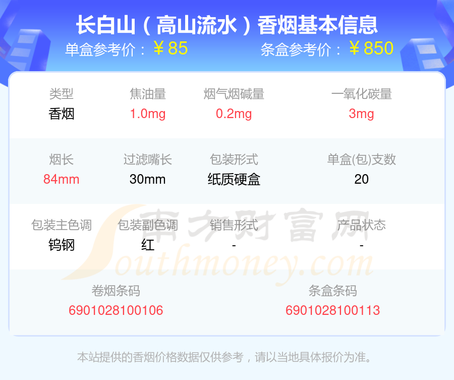择烟网为大家盘点了六十至九十元左右的长白山香烟,分别有长白山(高山流水)、长白山(德容天下)等,具体价格如下: