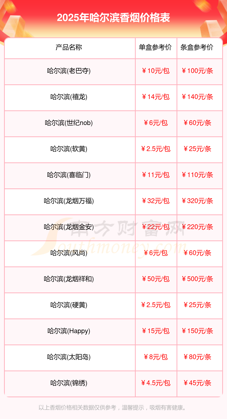 以上香烟价格相关数据仅供参考,温馨提示,吸烟有害健康。