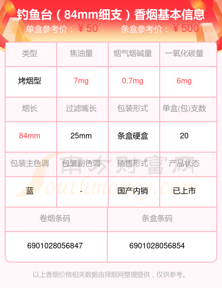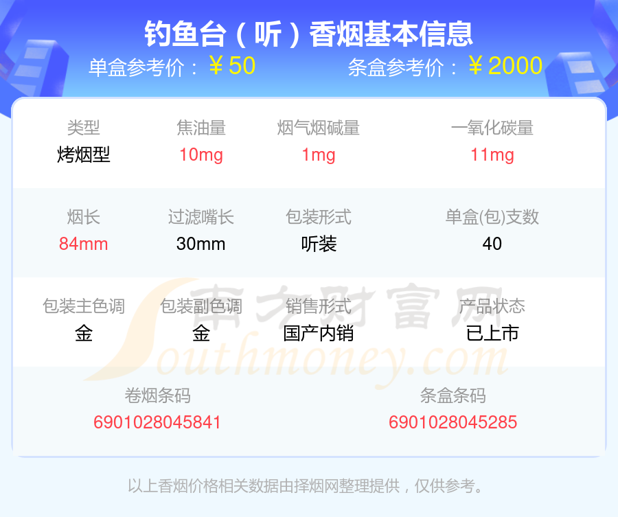 钓鱼台香烟三十元至六十元左右的烟分别有钓鱼台(100mm细支)参考价60元/包、钓鱼台(中支)参考价55元/包、钓鱼台(听)参考价50元/包、钓鱼台(84mm细支)参考价50元/包等。
