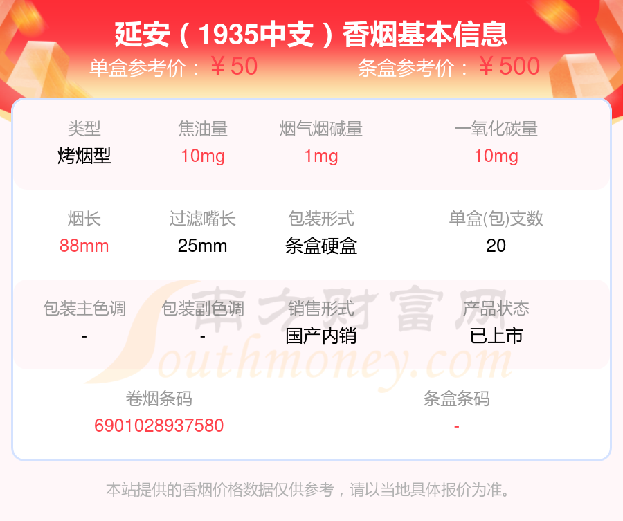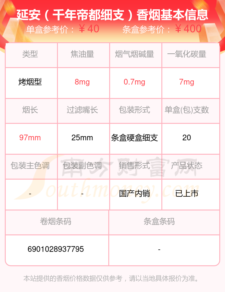 延安(1935)参考价50.0元/包、延安(中支1935)参考价50元/包、延安(1935中支)参考价50元/包、延安(红色记忆)参考价45.0元/包、延安(细支千年帝都)参考价40.0元/包、延安(千年帝都细支)参考价40元/包、延安(圣地河谷)参考价30元/包等。
