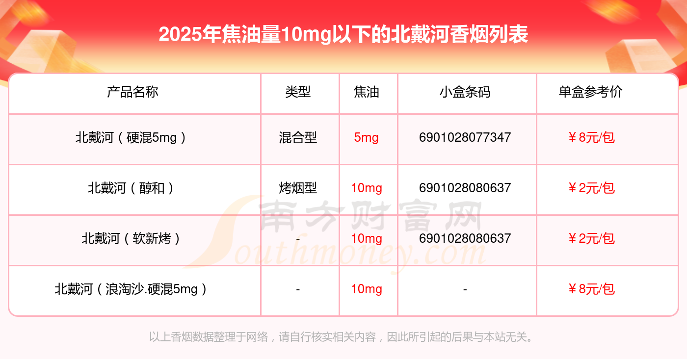 北戴河香烟焦油量10mg以下的烟有北戴河(硬混5mg)、北戴河(醇和)、北戴河(软新烤)、北戴河(浪淘沙.硬混5mg)等,详细价格如下: