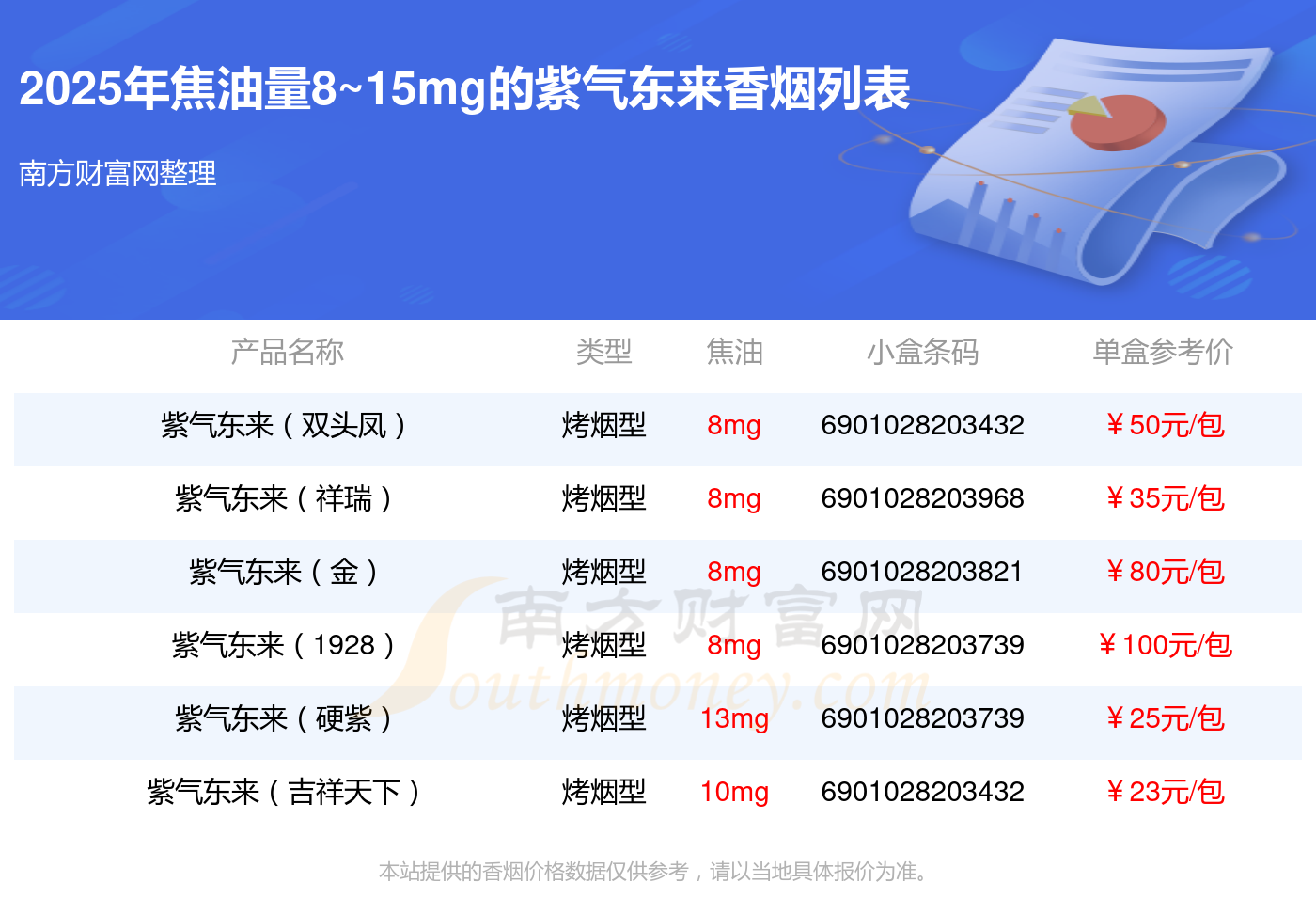 焦油量8~15mg的紫气东来香烟有哪些?择烟网为大家整理盘点,有紫气东来(双头凤)、紫气东来(祥瑞)、紫气东来(金)、紫气东来(1928)、紫气东来(硬紫)、紫气东来(吉祥天下)等,详细价格如下: