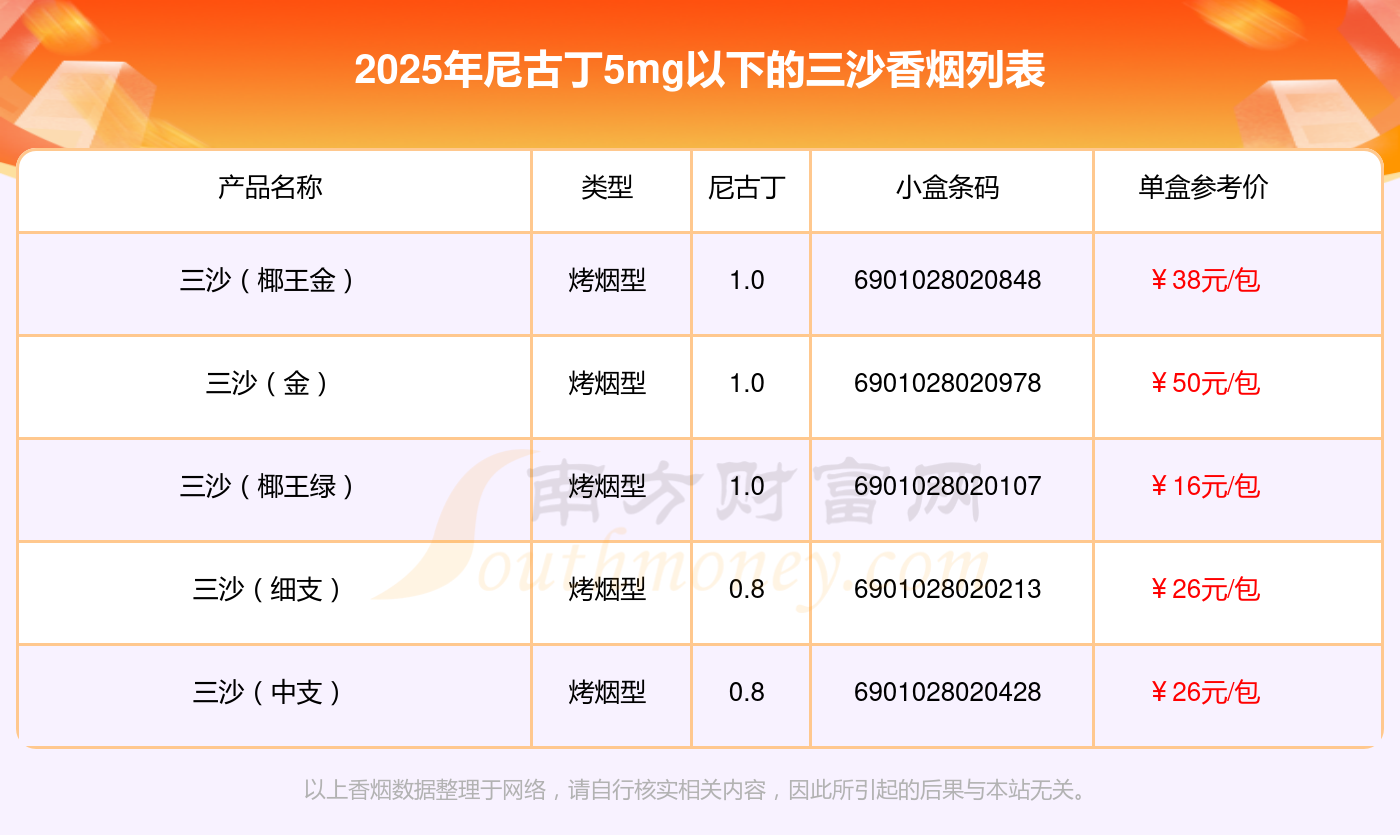 尼古丁5mg以下的三沙香烟有哪些?择烟网为大家整理盘点,分别有:三沙(椰王金)、三沙(金)、三沙(椰王绿)、三沙(细支)、三沙(中支)等,具体价格如下: